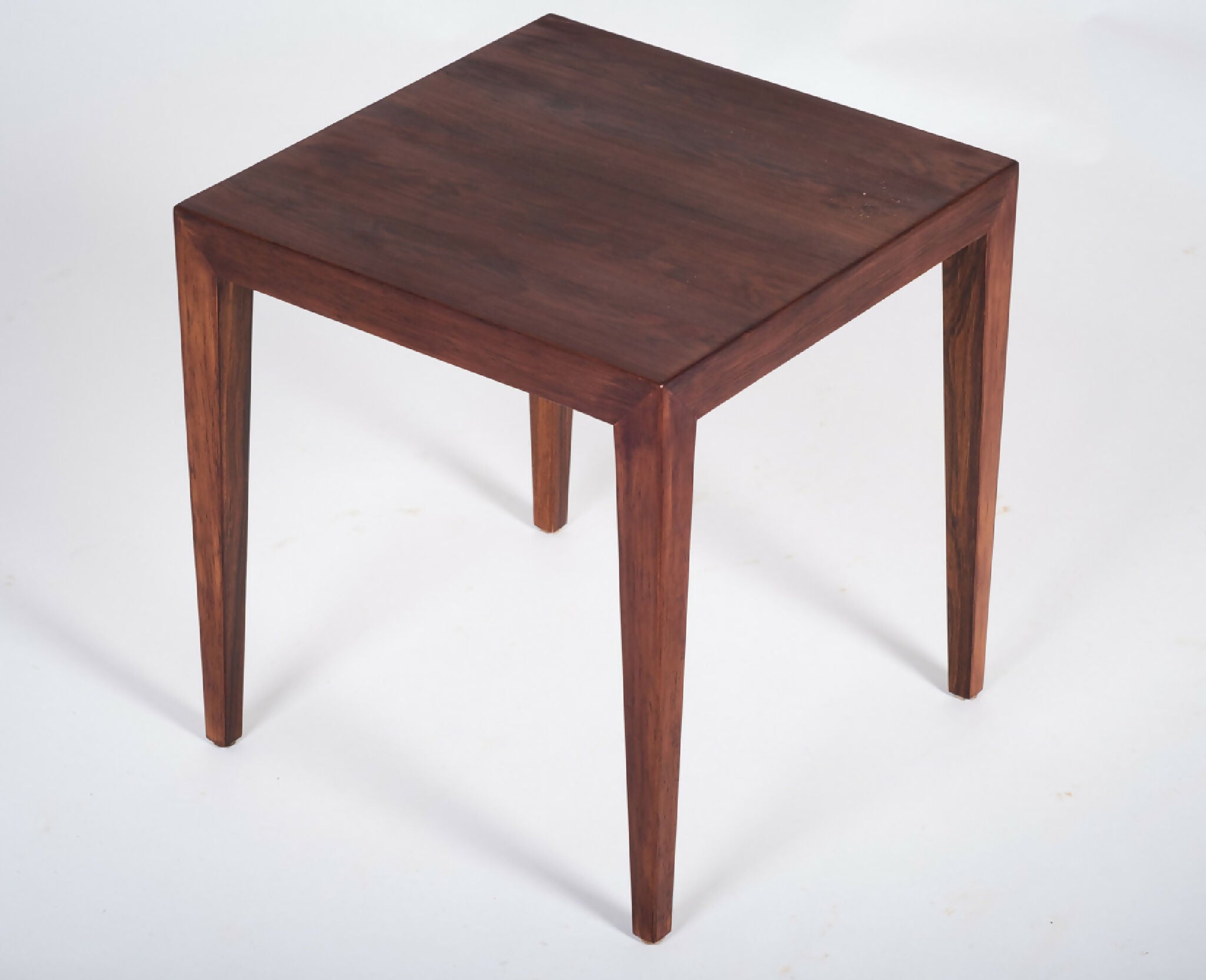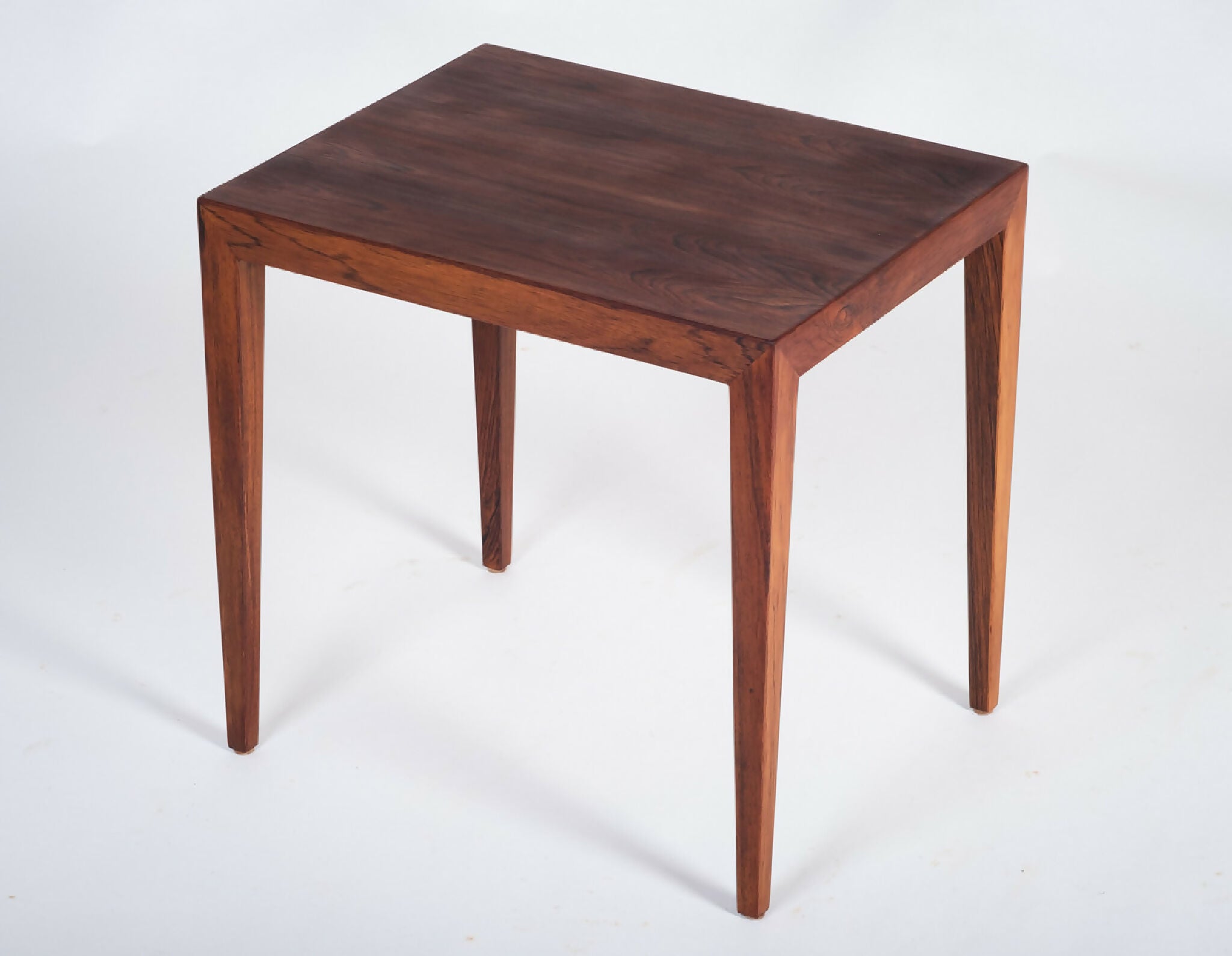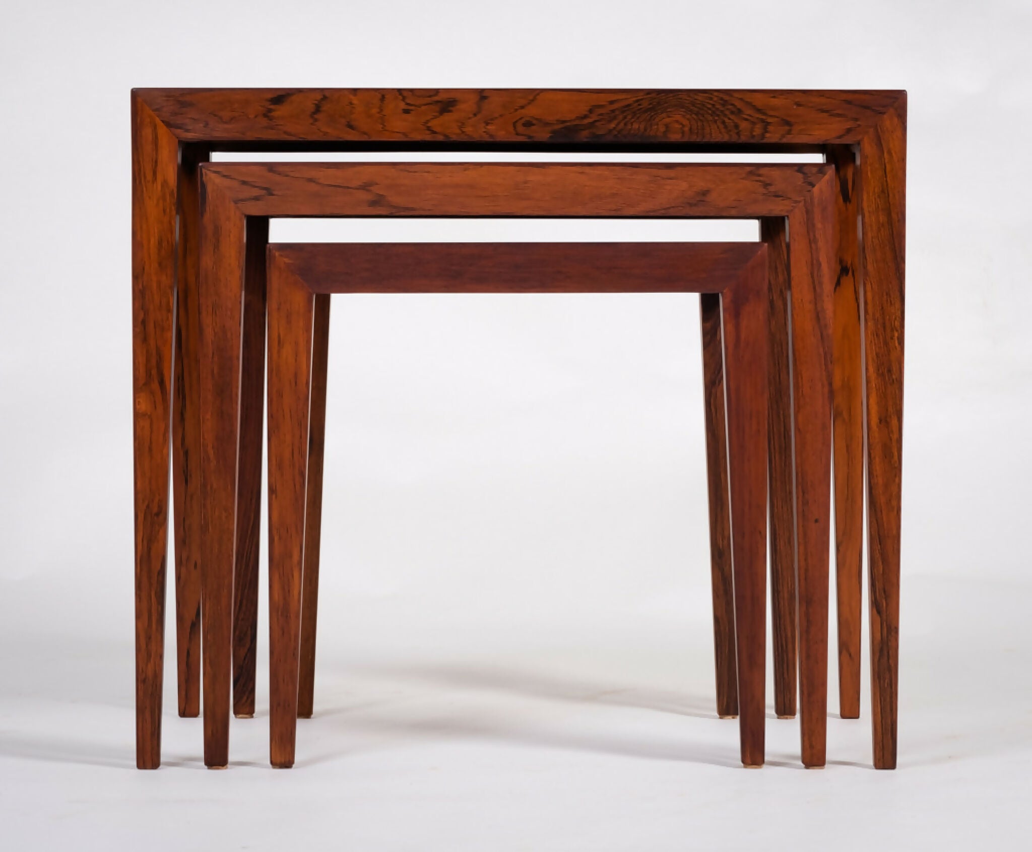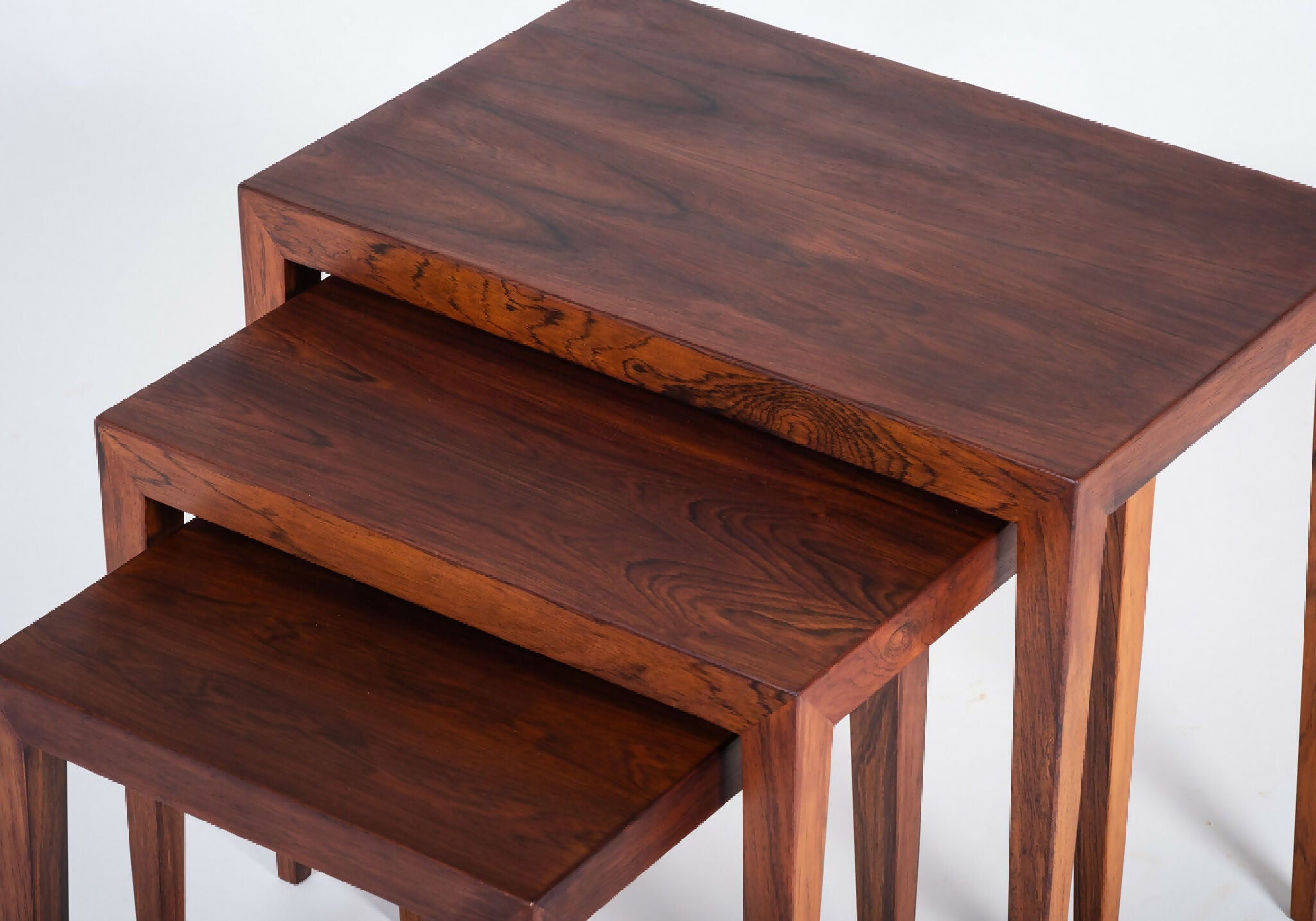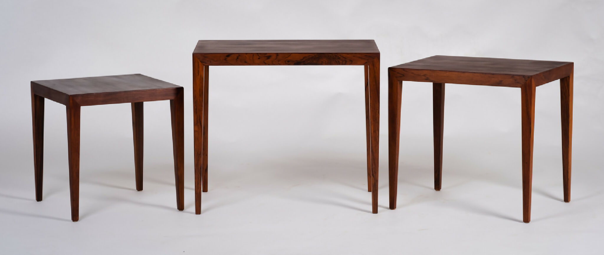 Model indskudsborde designet af Severin Hansen for Haslev Møbelsnedkeri i 1960’erne. Sættet består af tre borde udført i palisander med karakteristiske spidse samlinger og let tilspidsede ben – et kendetegn for Hansens elegante og præcise formsprog. Designet er minimalistisk, men med stor sans for proportioner og detaljer, som gør sættet til et tidløst eksempel på dansk snedkerkunst.
