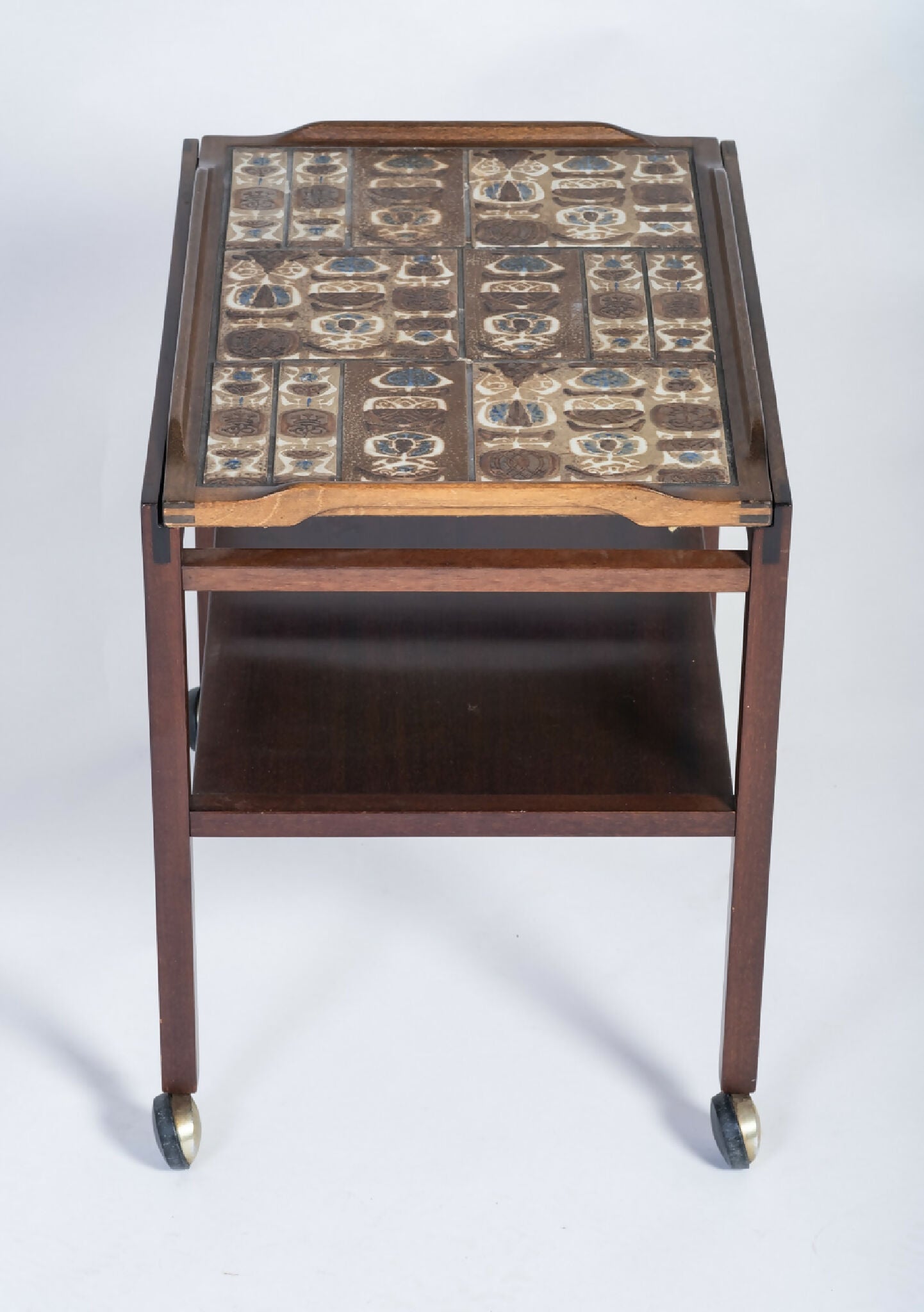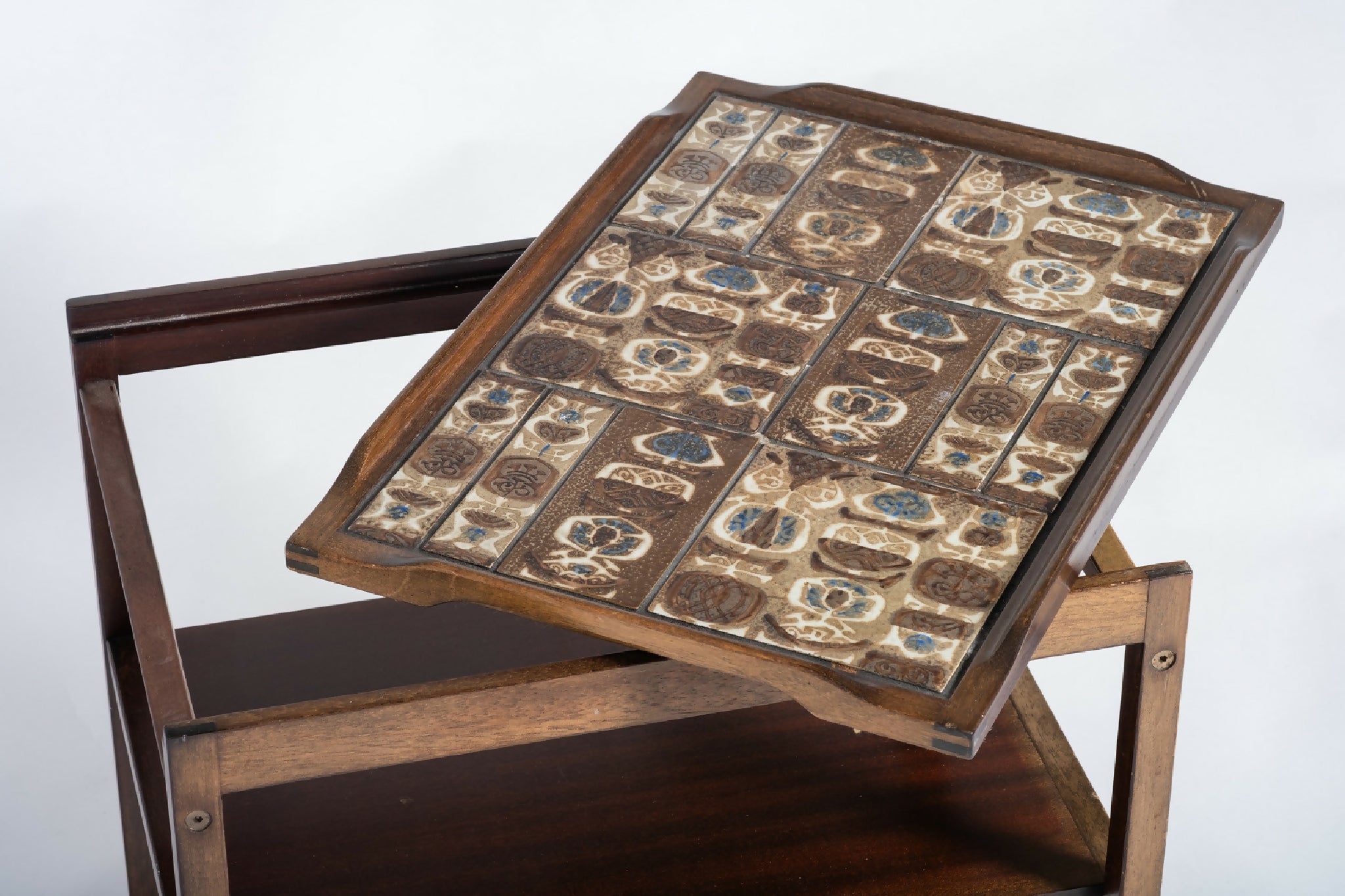 Serveringsbord designet af Severin Hansen og fremstillet af Haslev Møbelsnedkeri i Danmark i 1960’erne. Bordet er udført i fineret mahogni med vendbar bordplade, hvor den ene side er belagt med keramiske BACA-fliser fra Royal Copenhagen. Bordet står på hjul, hvilket giver fleksibilitet og funktionalitet, både som serveringsvogn og som sidebord.