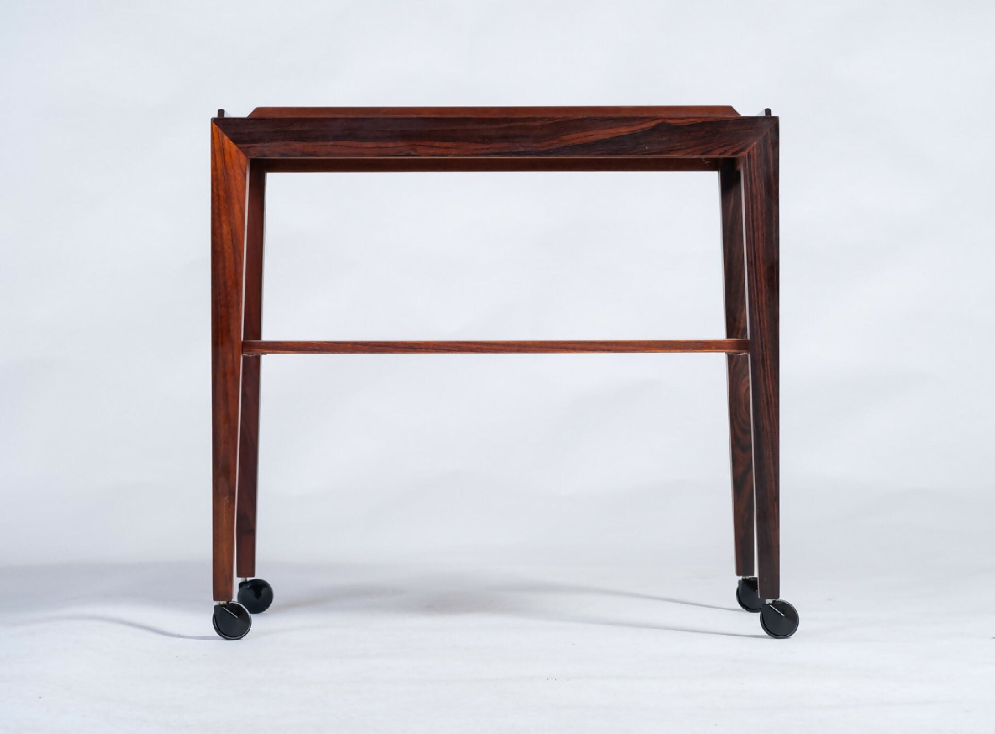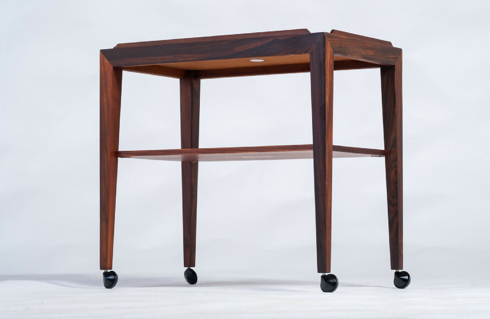 Det lette udtryk og de karakteristiske tap-samlinger er typiske for Severin Hansens designs. Bordet står på hjul, hvilket gør det både funktionelt og fleksibelt i brug — perfekt som serveringsvogn, sidebord eller dekorativt element.