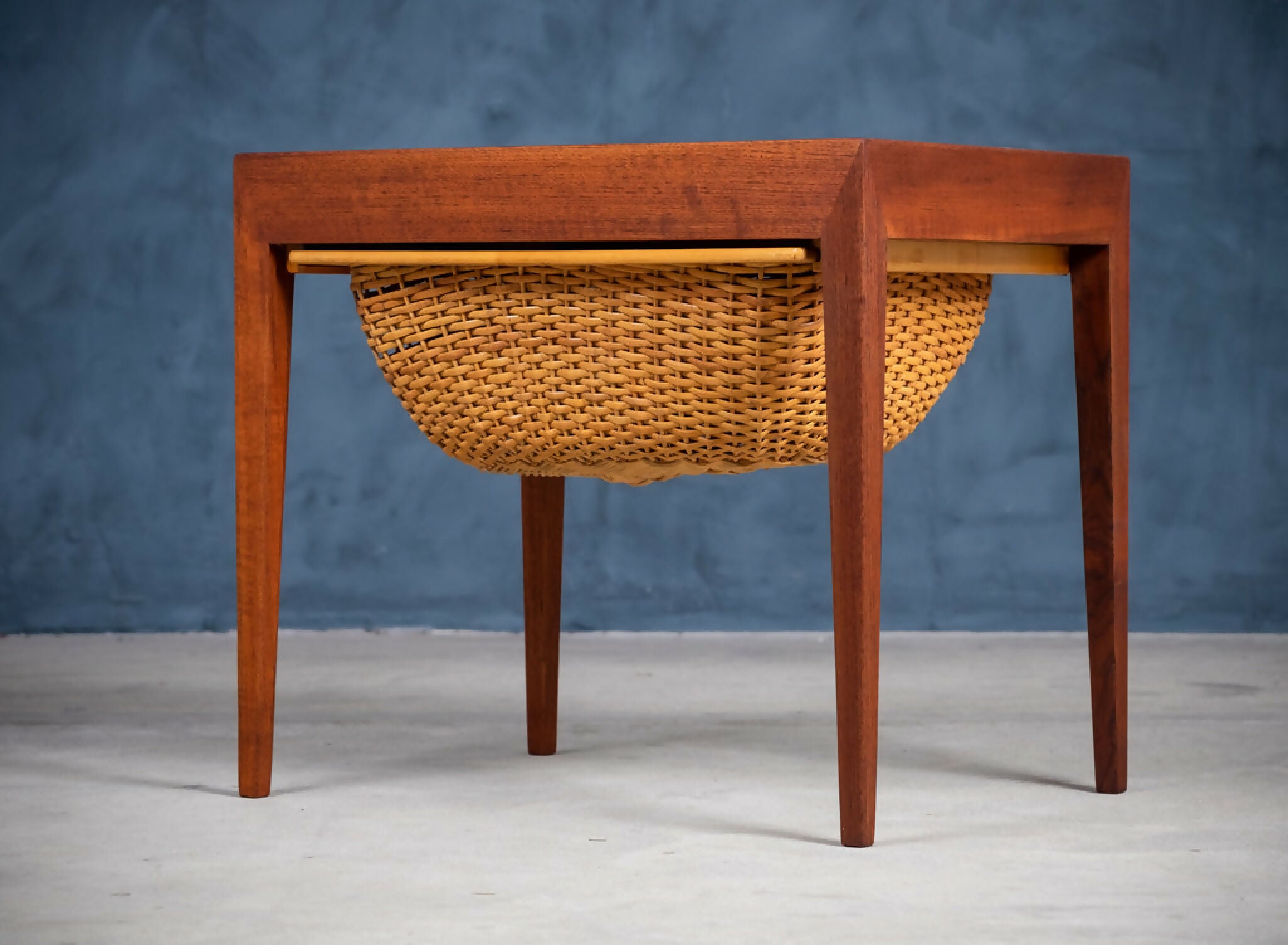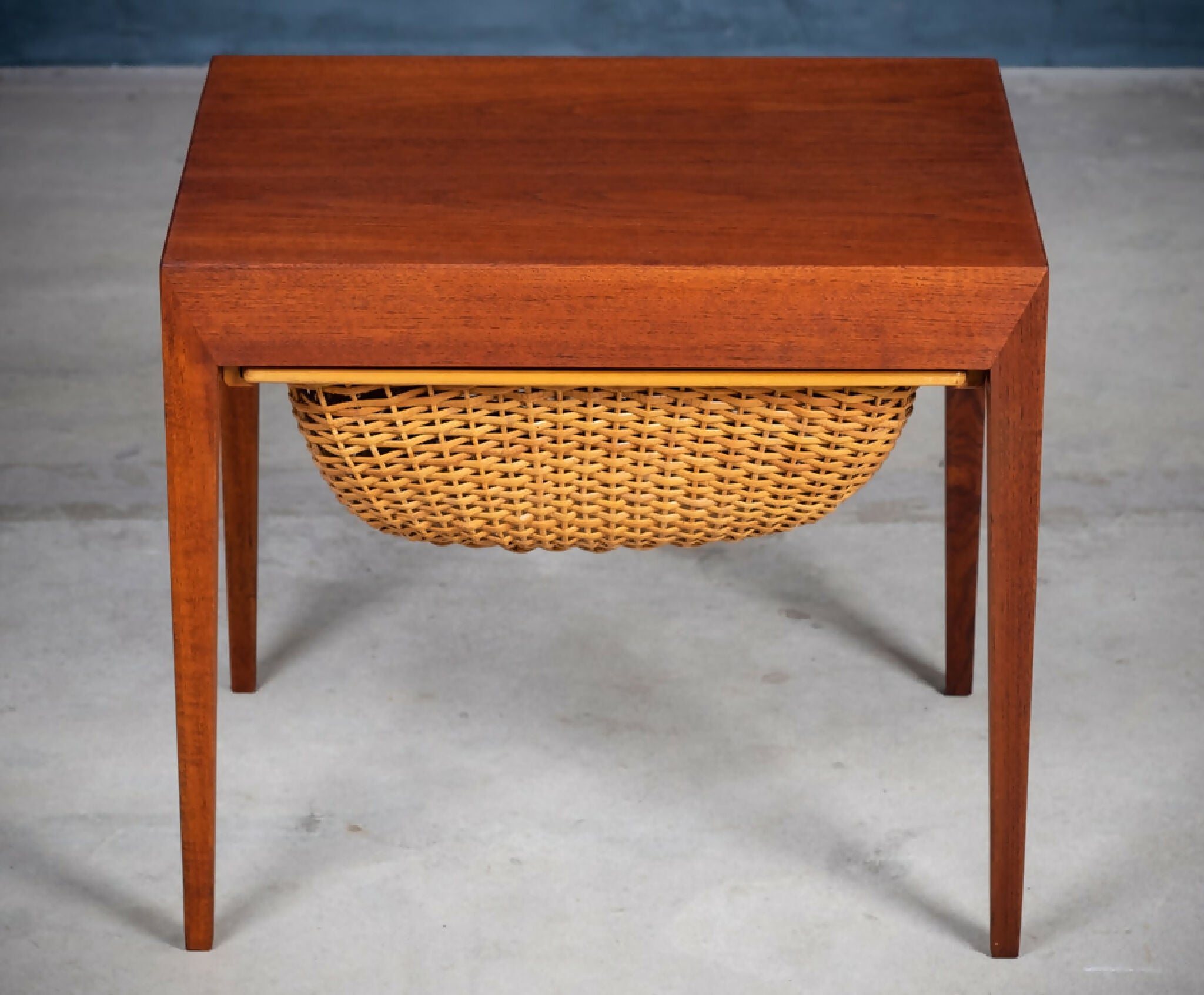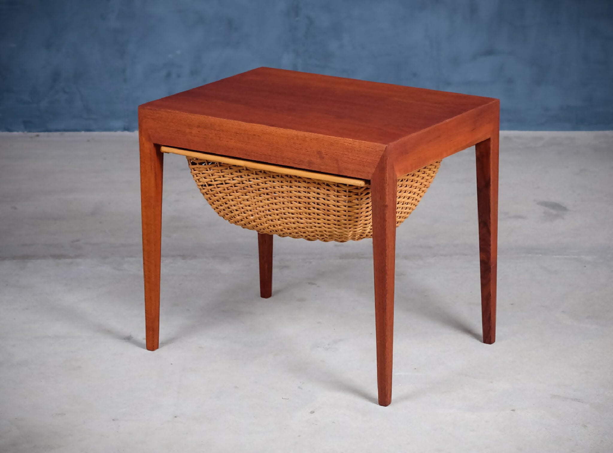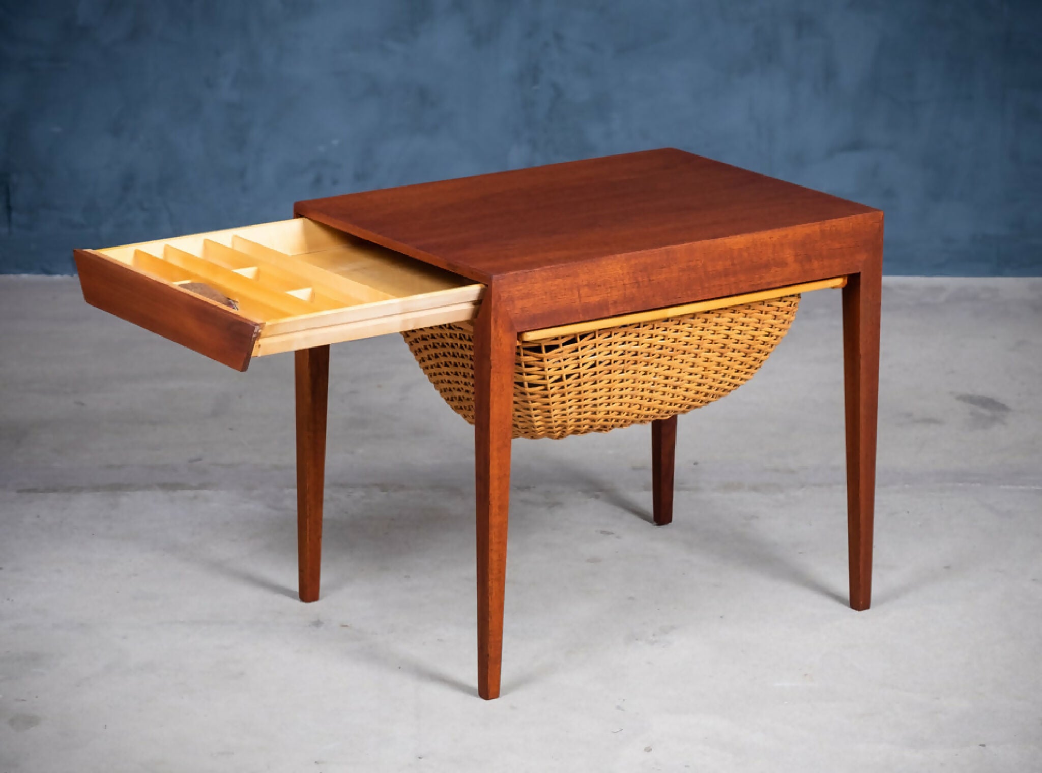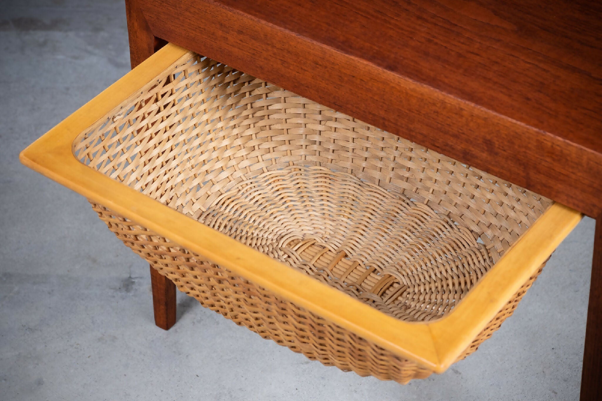 Model sminkebord designet af Severin Hansen og fremstillet af Haslev Møbelsnedkeri i Danmark. Et eftertragtet møbel udført i teak med et enkelt skuffemodul og en hylde i flet, som tilføjer lethed og materialemæssig kontrast. Formsproget er karakteristisk for dansk design i 1950’erne, hvor rene linjer og funktionalitet går hånd i hånd.