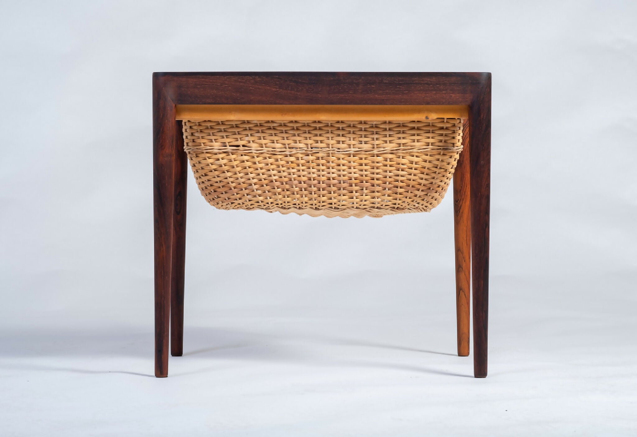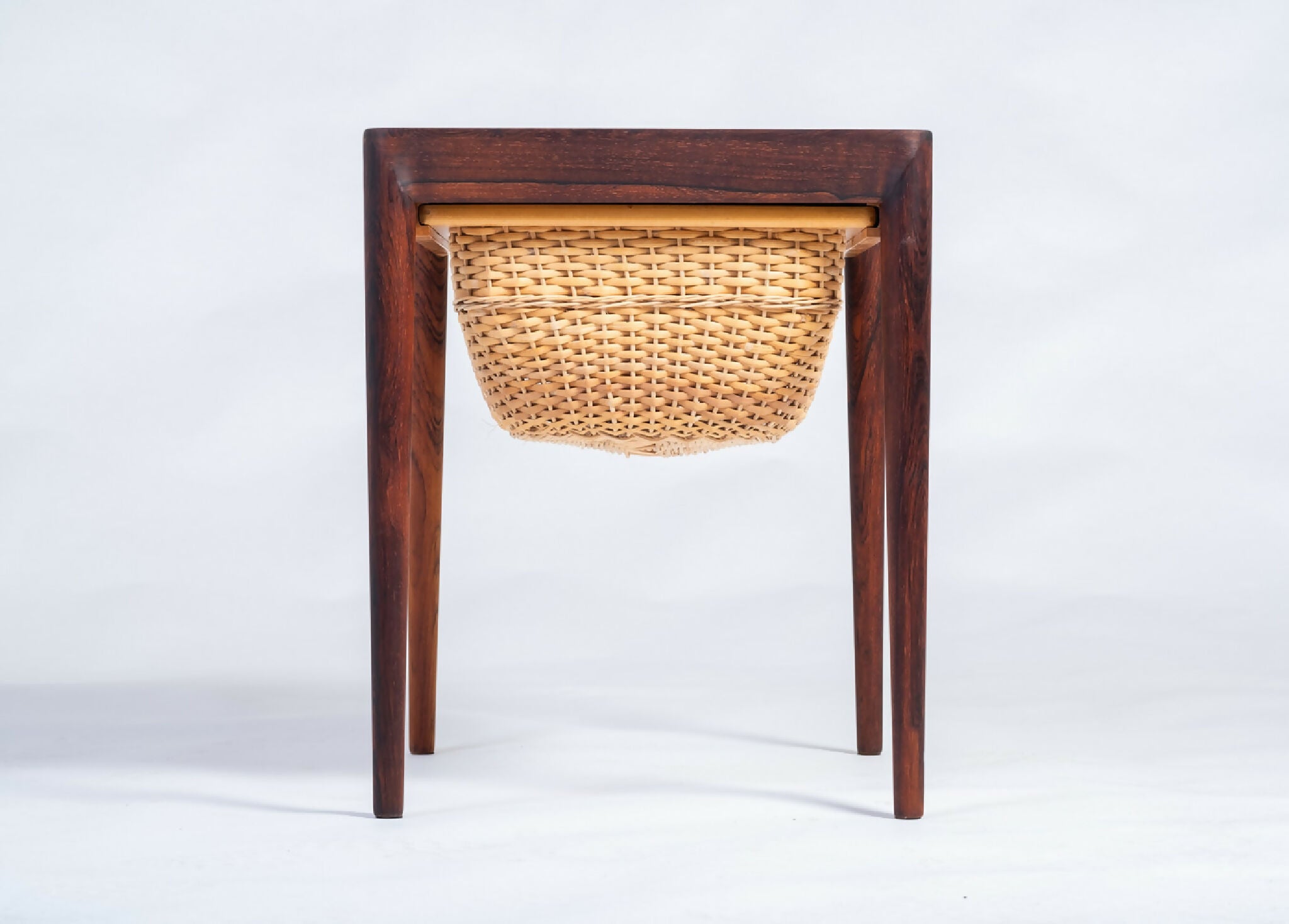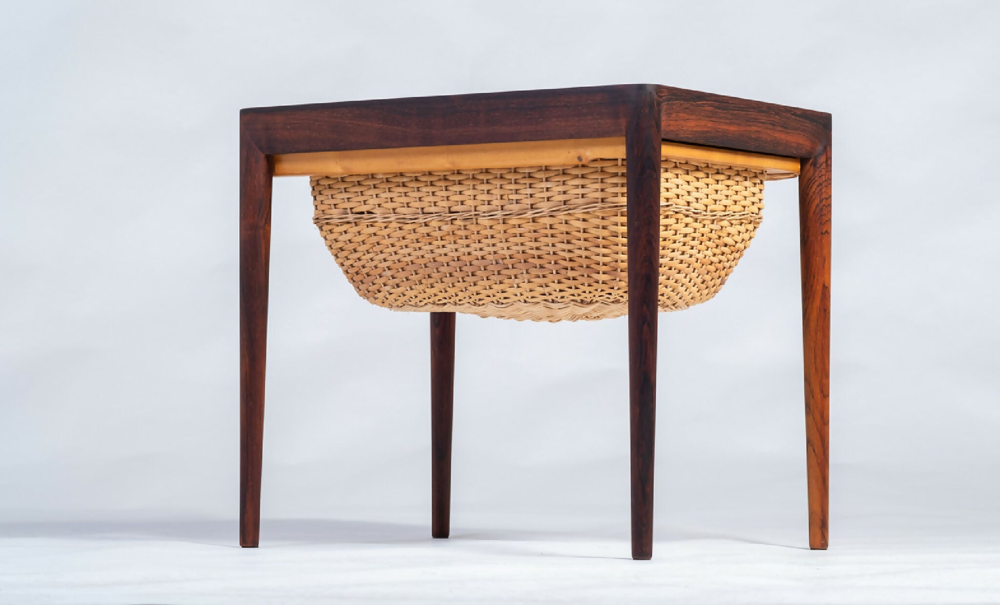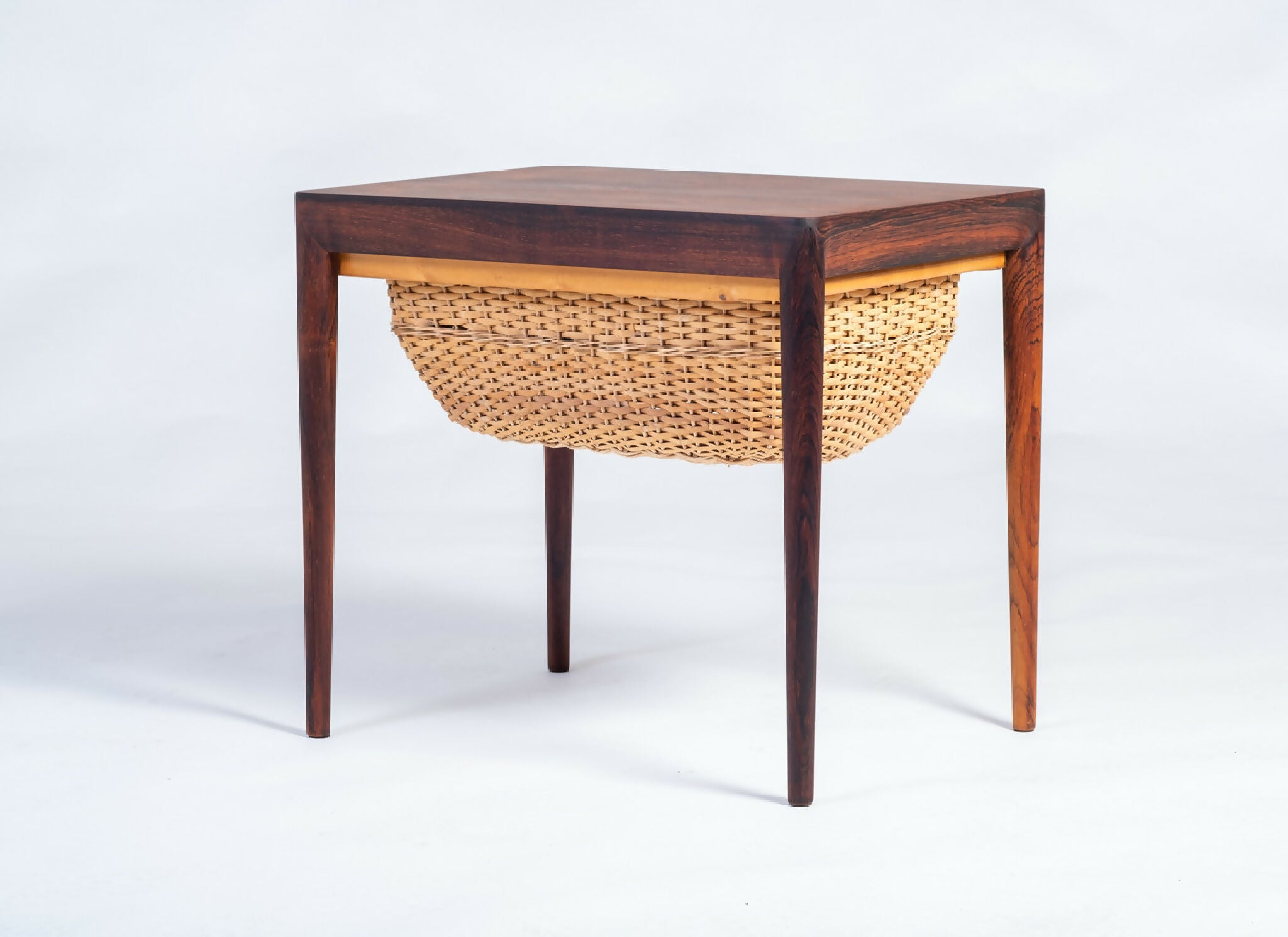 Model sybord designet af Severin Hansen og fremstillet af Haslev Møbelsnedkeri i 1960’erne. Bordet er udført i palisander med fine snedkerdetaljer, der fremhæver træets naturlige åretegning og dybe glød. Under bordpladen findes praktisk opbevaring, som vidner om dansk designs evne til at forene funktion og æstetik.