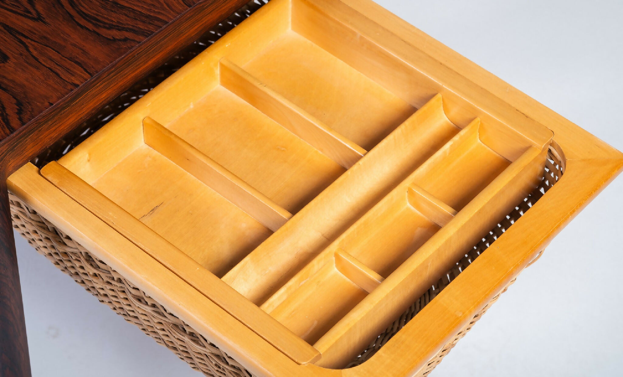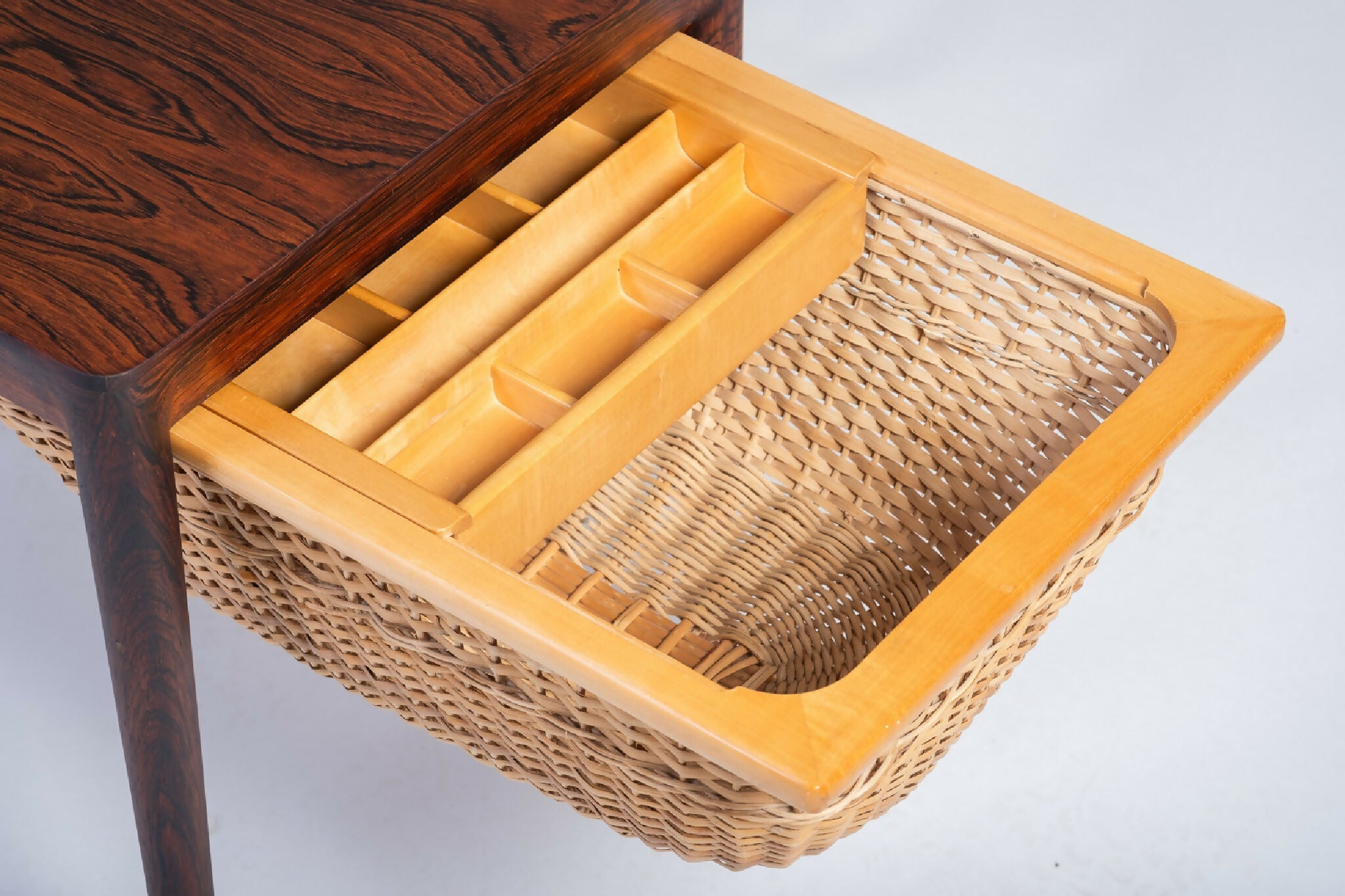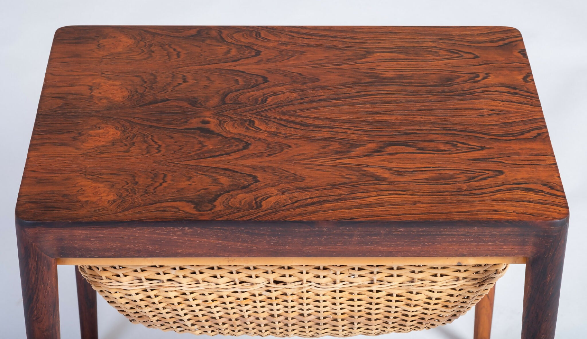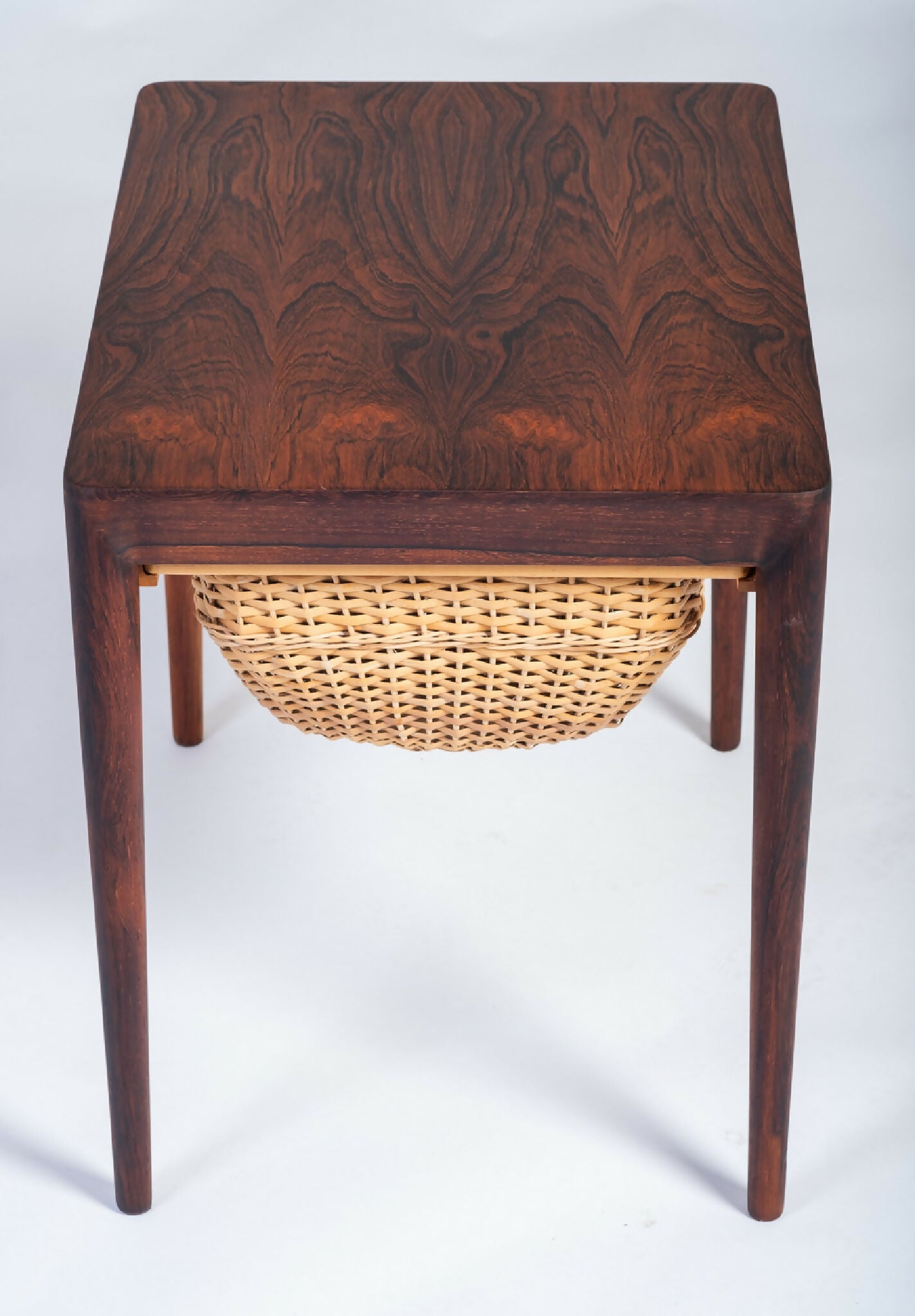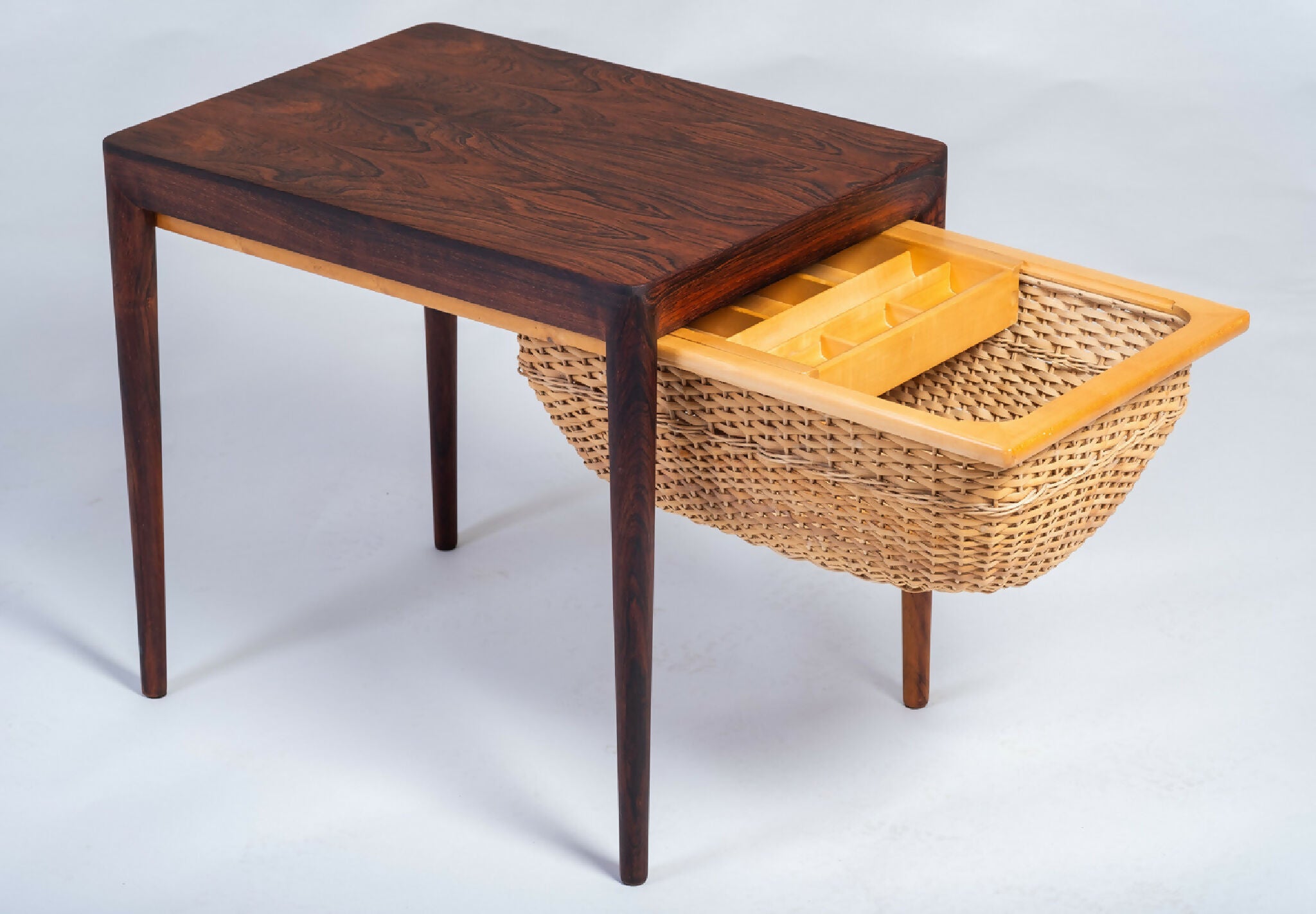 Model sybord designet af Severin Hansen og fremstillet af Haslev Møbelsnedkeri i 1960’erne. Bordet er udført i palisander med fine snedkerdetaljer, der fremhæver træets naturlige åretegning og dybe glød. Under bordpladen findes praktisk opbevaring, som vidner om dansk designs evne til at forene funktion og æstetik.
