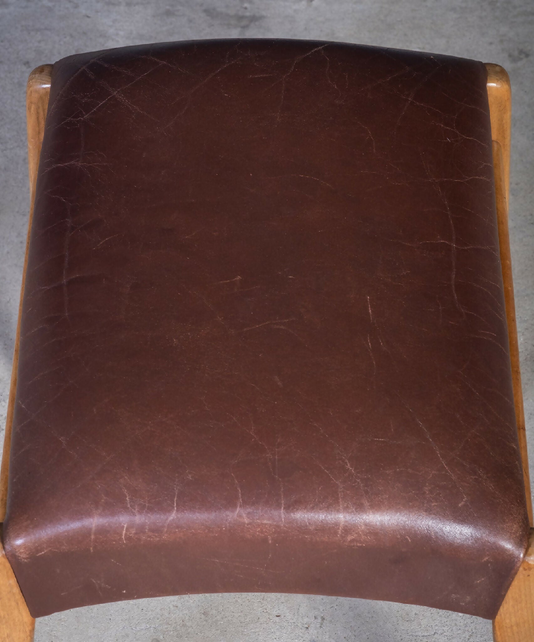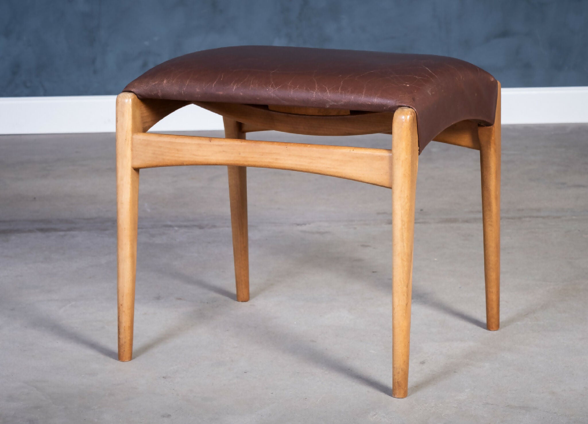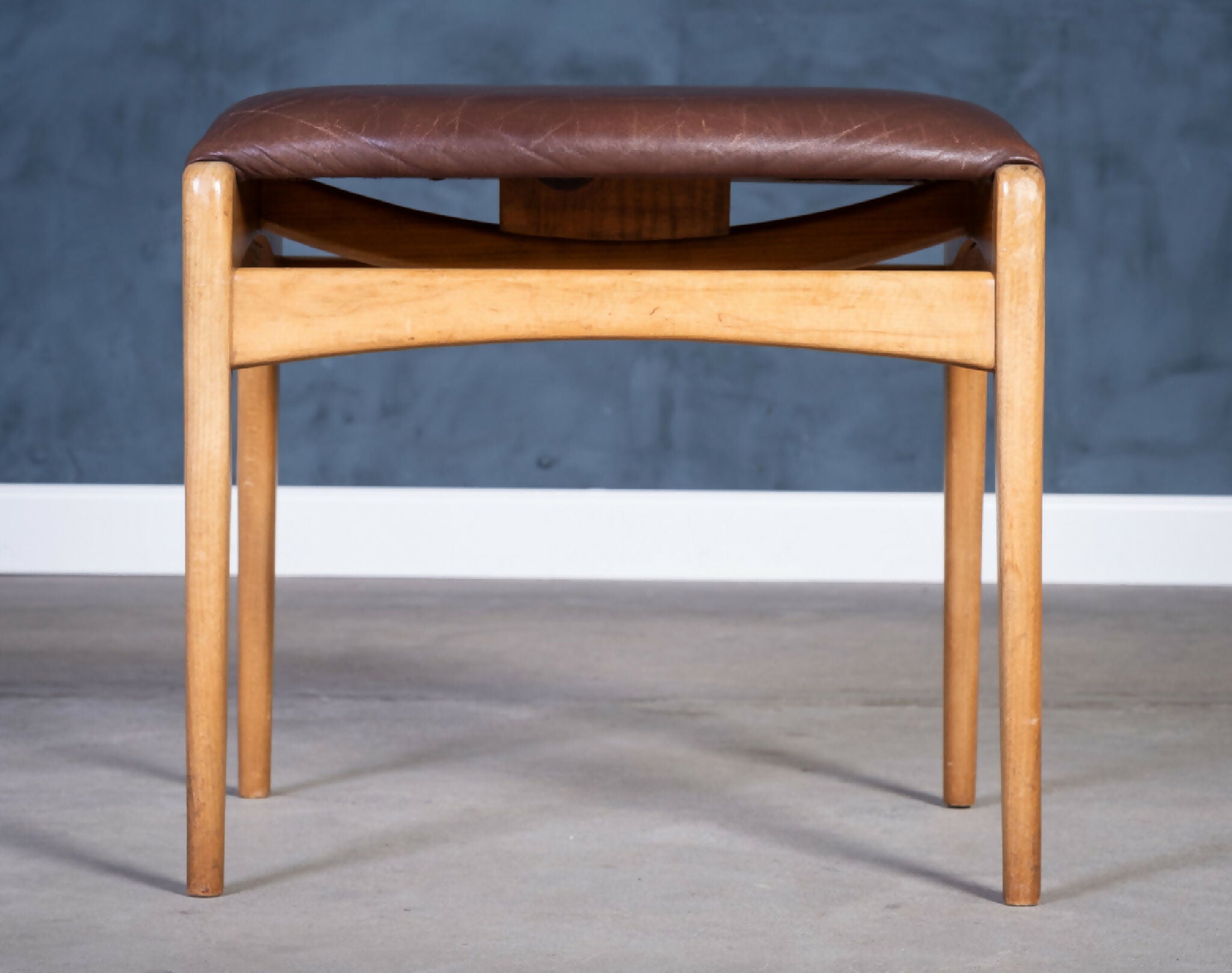 Model skammel fremstillet i Danmark i 1950’erne. Udført i massivt bøgetræ med original brun læderpolstring, der smukt fremhæver træets varme tone og naturlige struktur. Det enkle og funktionelle formsprog afspejler den skandinaviske designtradition, hvor kvalitet og æstetik forenes i et harmonisk udtryk.