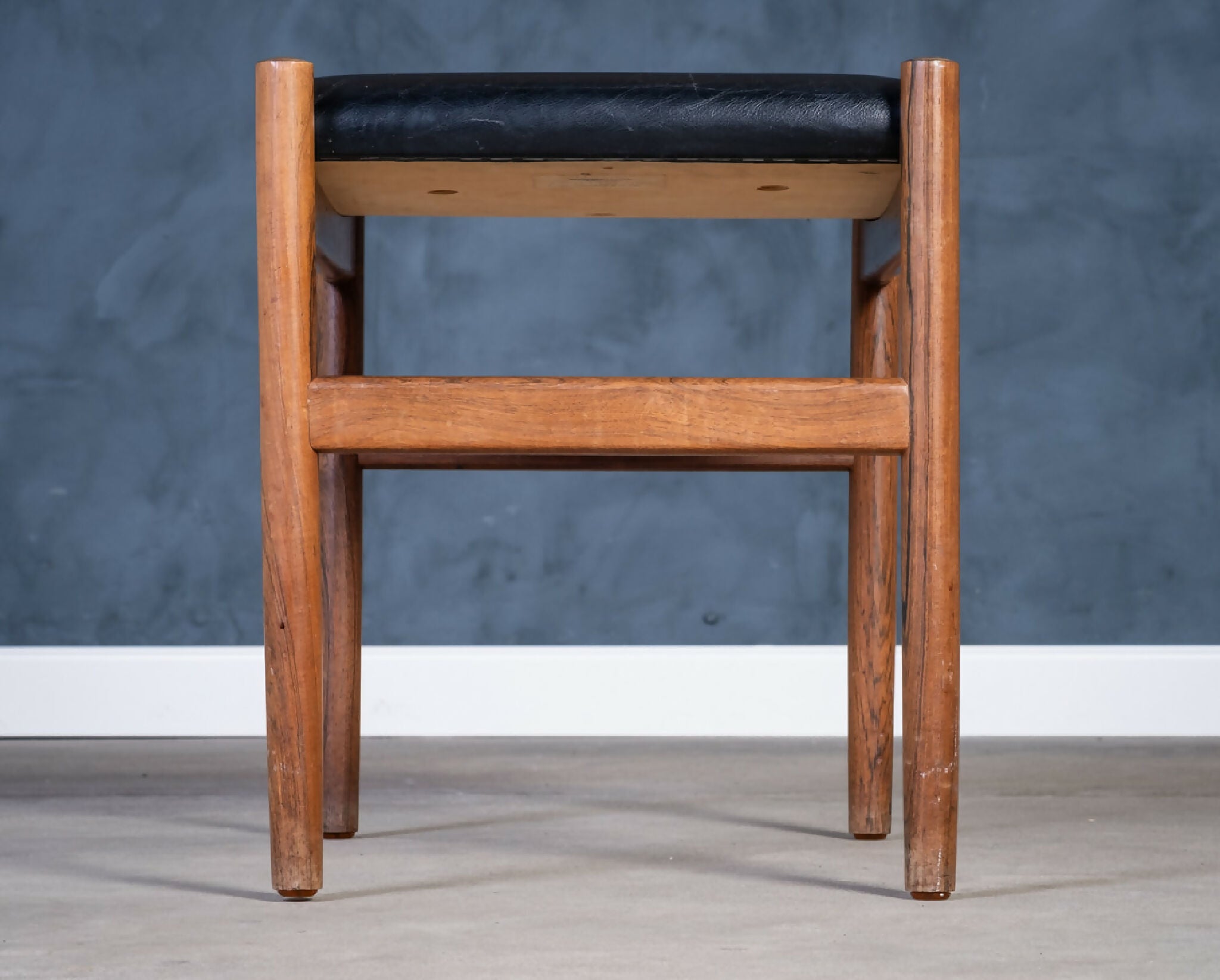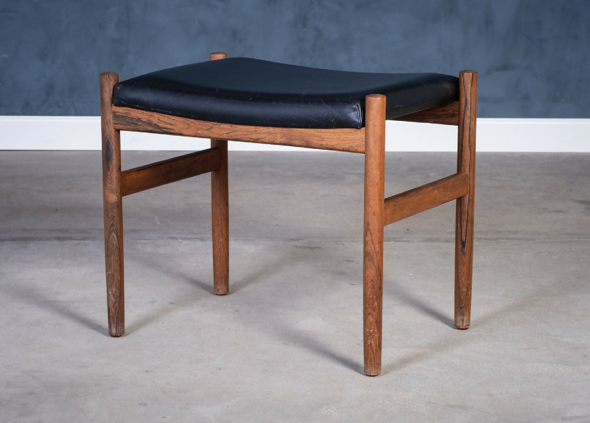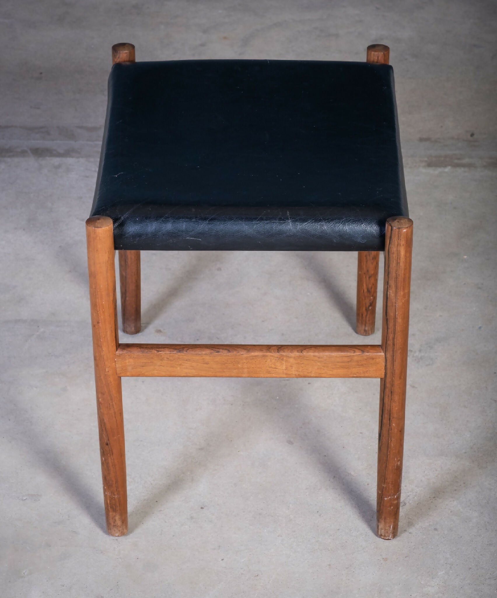 Model skammel fremstillet i Danmark i 1960’erne. Udført i massiv palisander med sort læderpolstring, der fremhæver træets dybe glød og elegante struktur. De præcise samlinger og det enkle formsprog vidner om et højt håndværksmæssigt niveau og afspejler den danske designtradition, hvor funktion og æstetik går hånd i hånd.