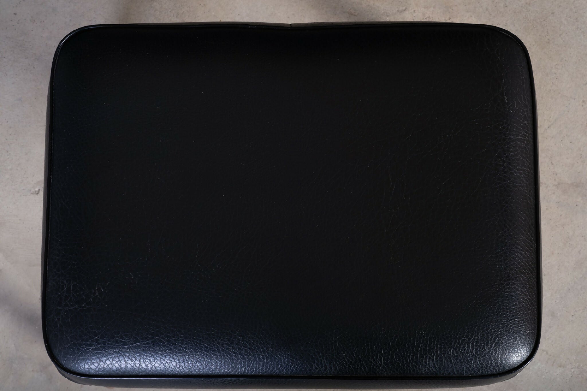 Model skammel fremstillet i Danmark i 1960’erne. Udført i massivt teaktræ med sort kunstlæderpolstring, der fremhæver den varme glød i træet og giver et elegant, tidløst udtryk. Det enkle formsprog og de rene linjer afspejler den danske designtraditions fokus på funktionalitet og æstetik i balance.