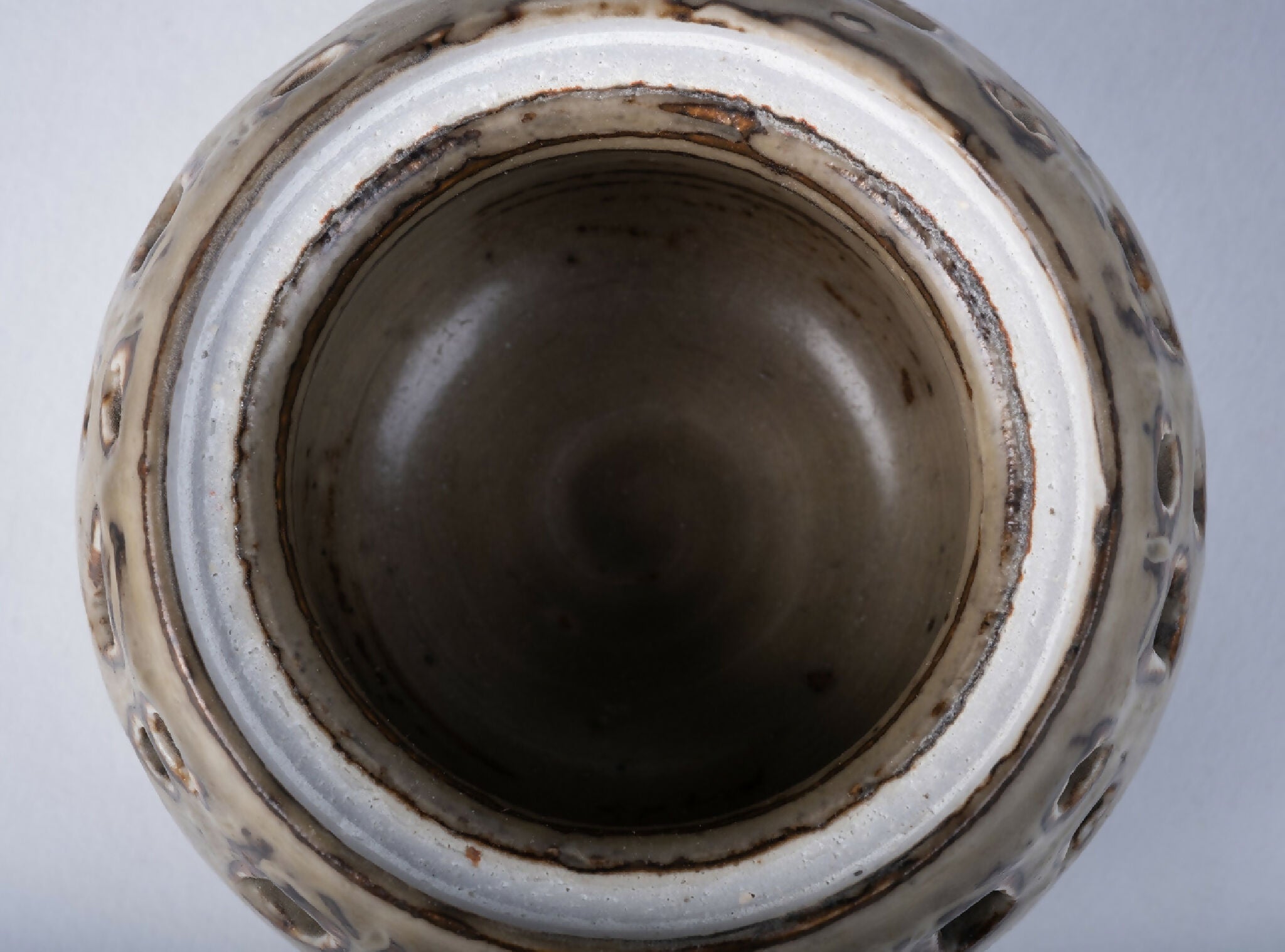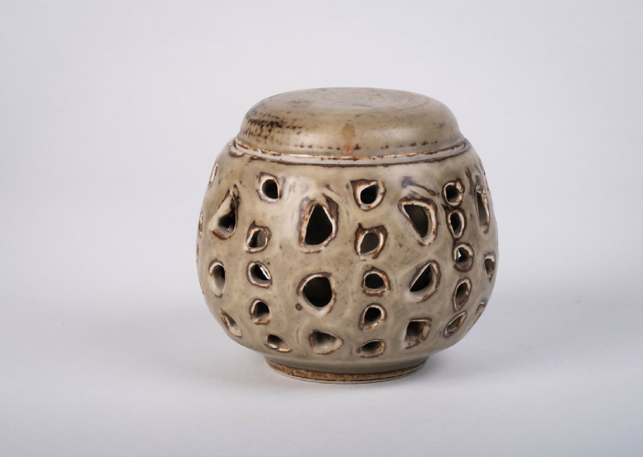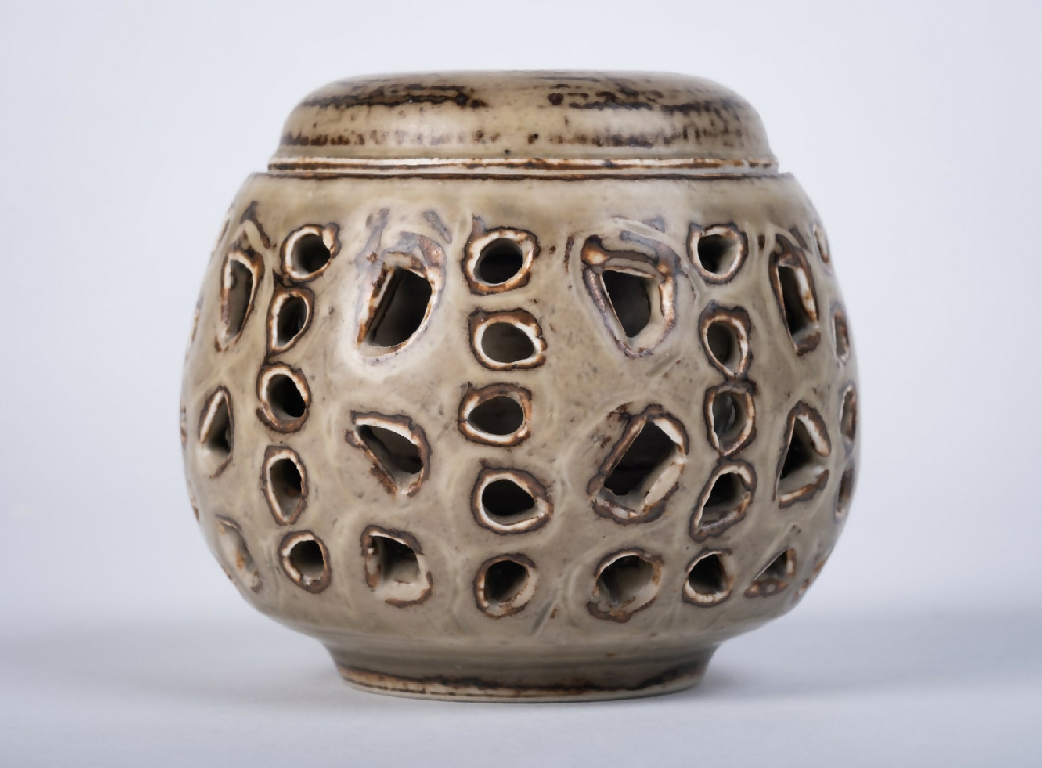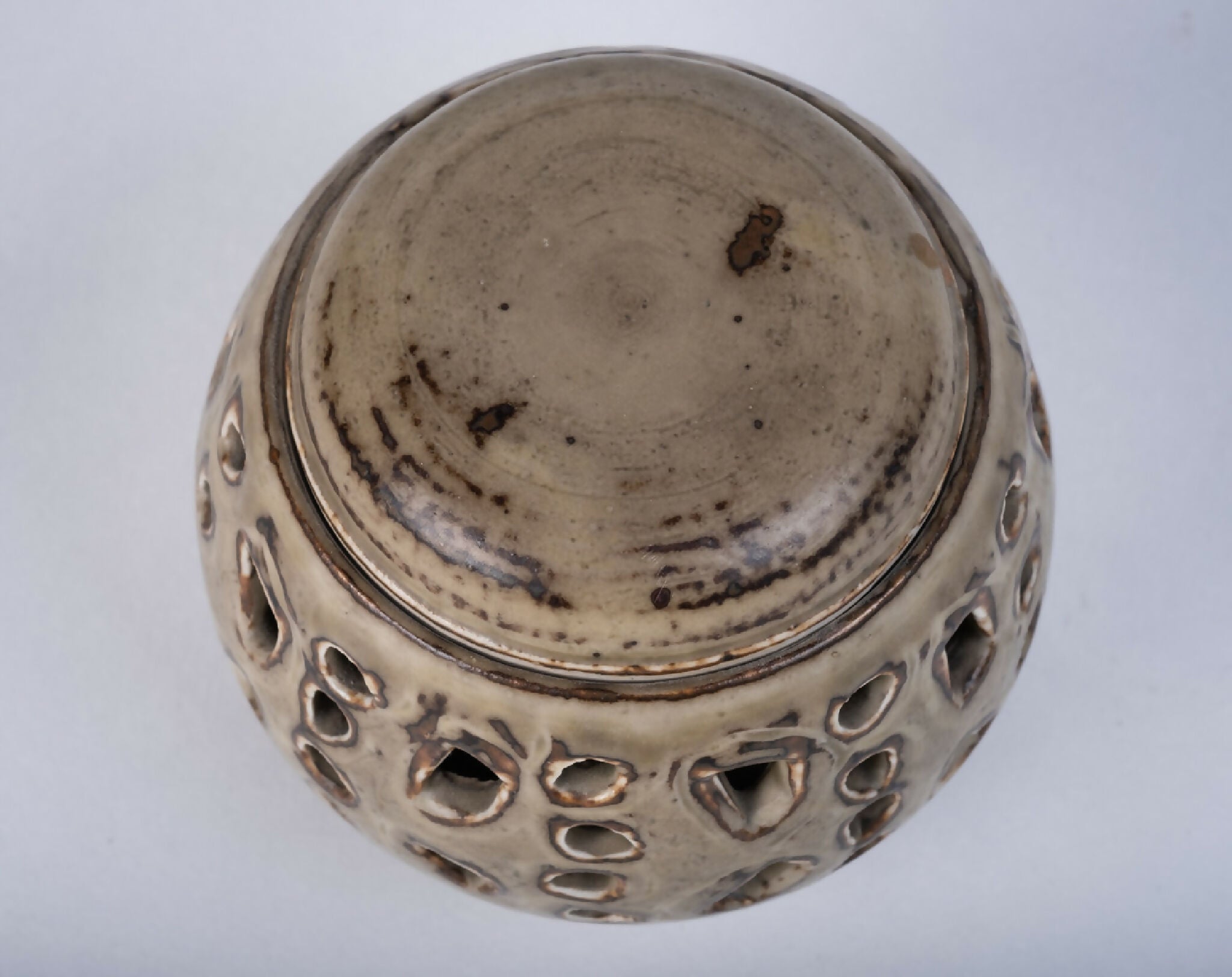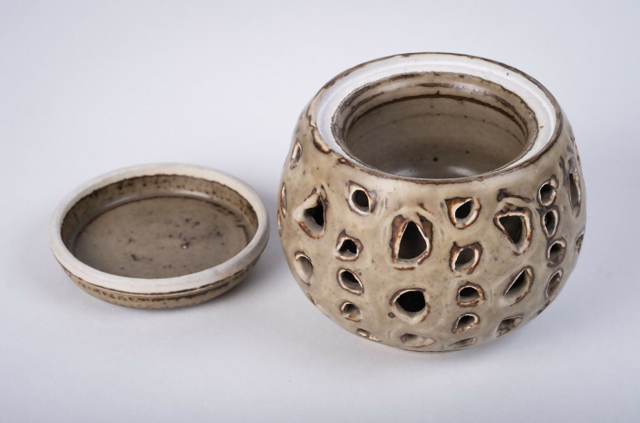 Keramikskål fra 1950’erne udført i et udskåret, perforeret mønster, som giver et dekorativt spil mellem lys og skygge. Skålen kan både anvendes som dekoration og som lysestage, hvor hullerne skaber et varmt og levende lysmønster. Formen er enkel og afbalanceret med et tidstypisk udtryk for dansk keramik fra perioden.