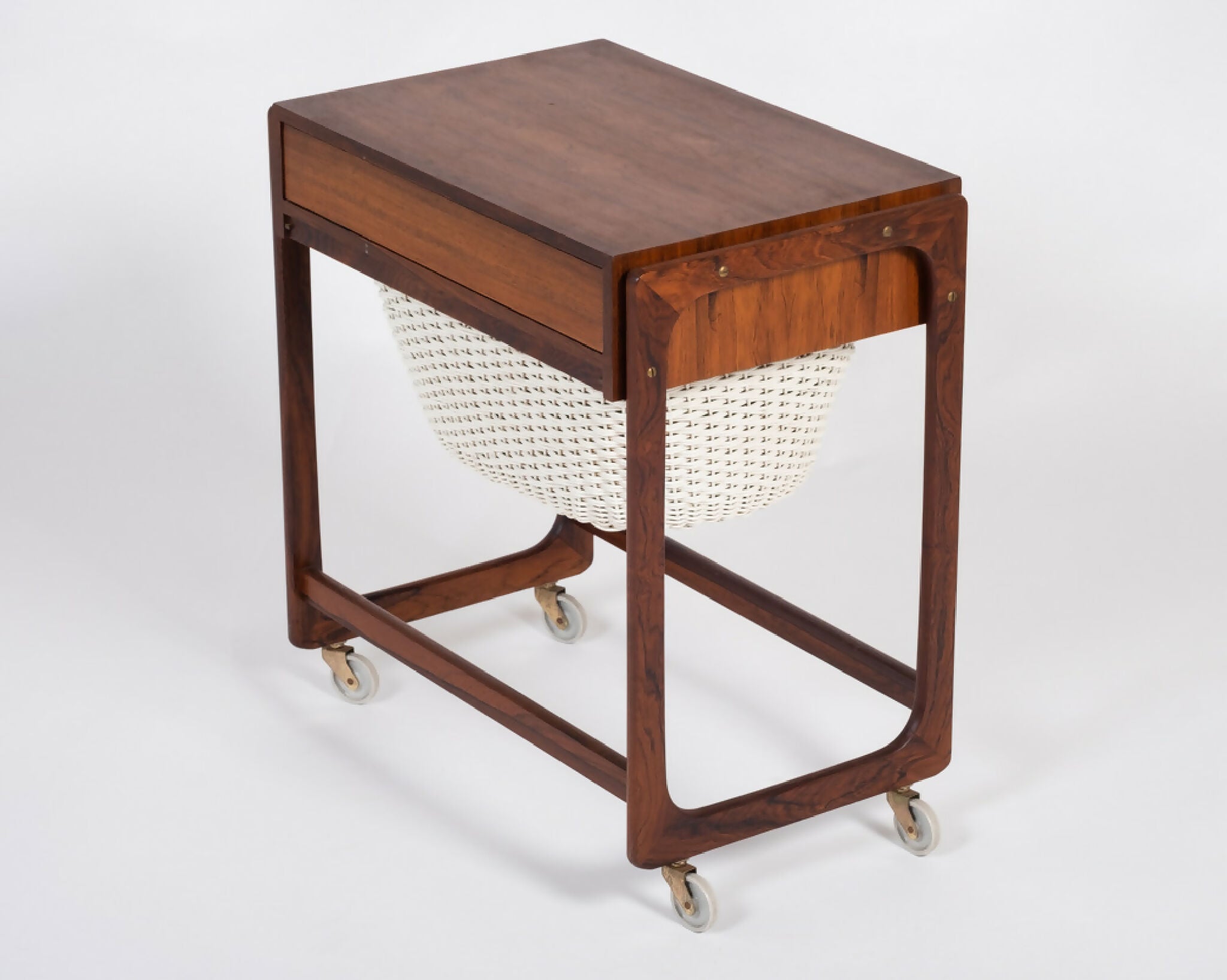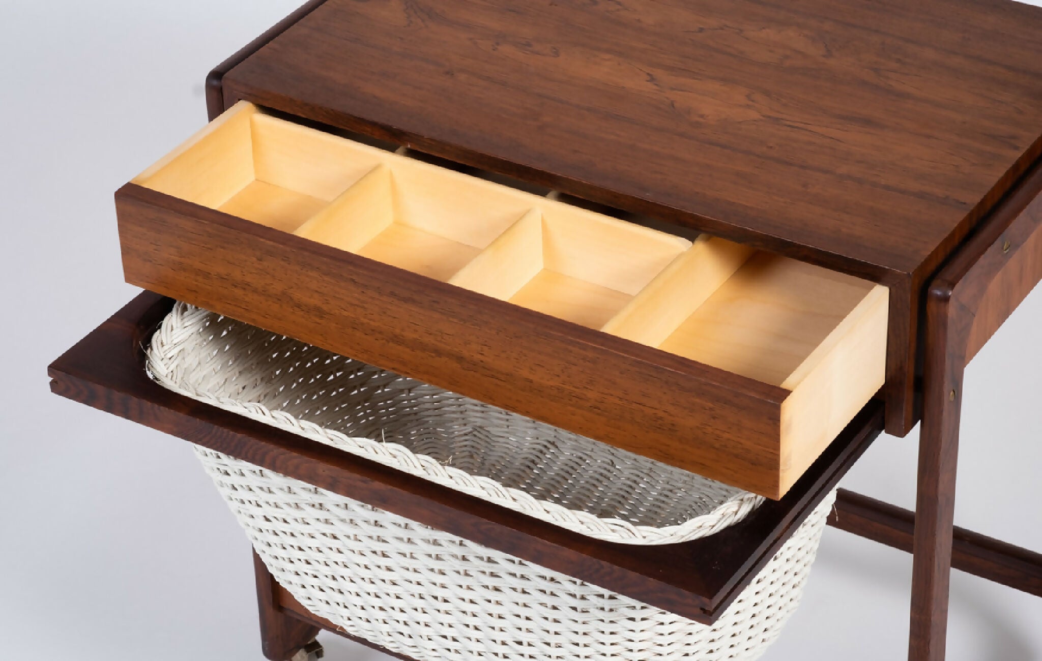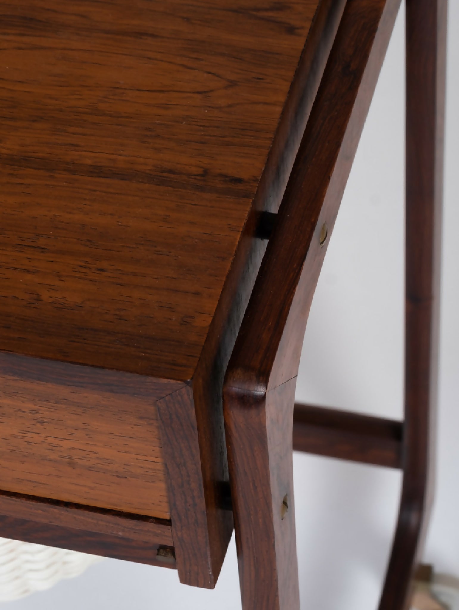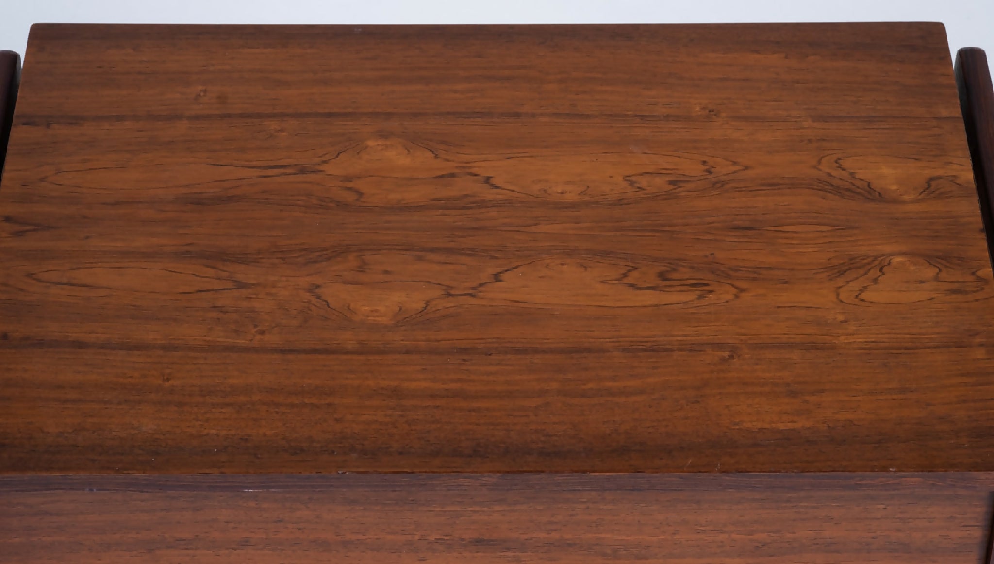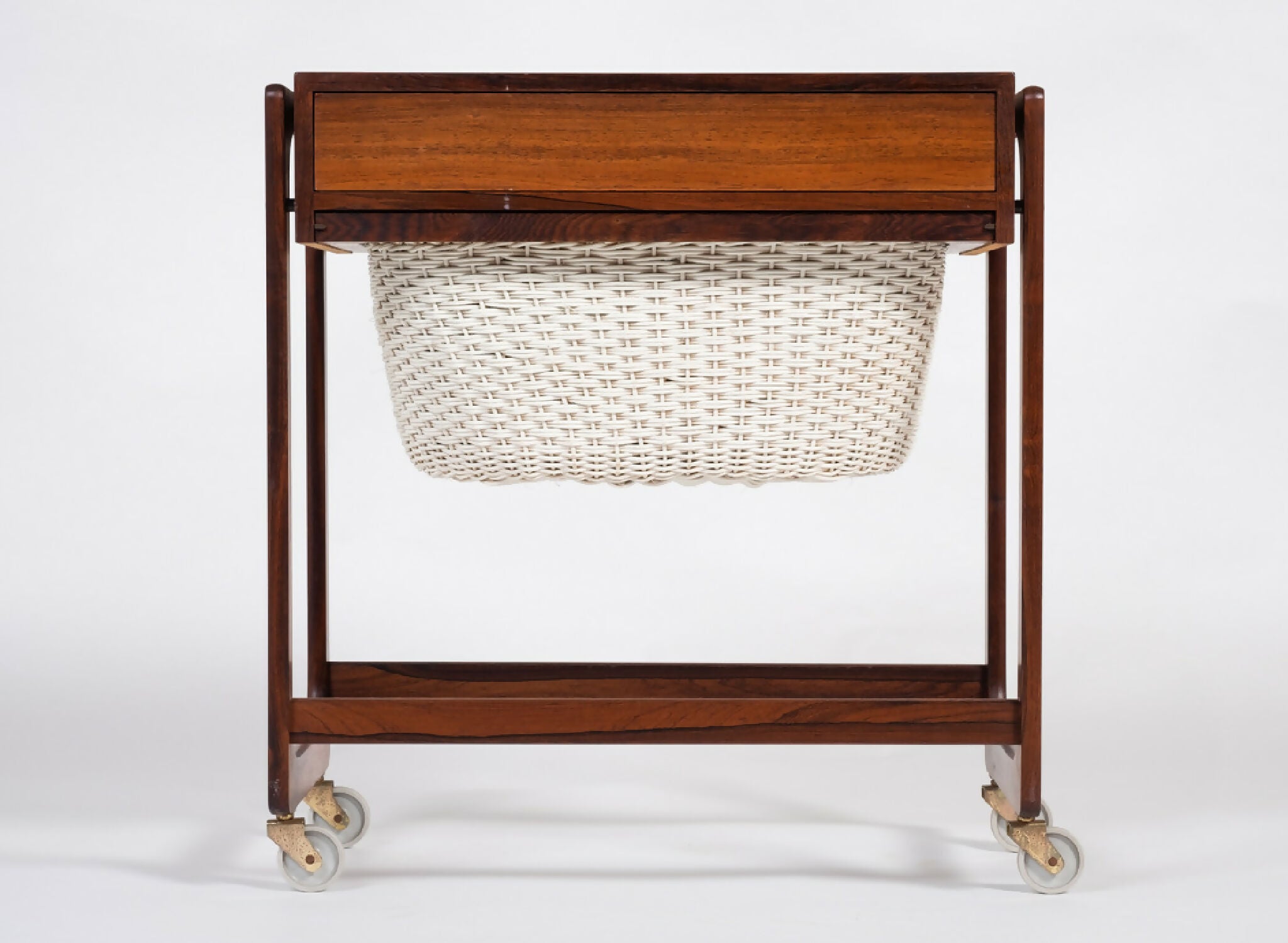 Model sminkebord udført i palisander og fremstillet af BR Gelsted i Danmark omkring 1960’erne. Møblet har en varm brun tone og et karakteristisk fletkurvselement under bordpladen, som skaber en harmonisk balance mellem materialerne. Skuffen glider let og giver god opbevaringsplads til diverse småting. Bordet står på hjul, hvilket gør det nemt at flytte rundt efter behov.