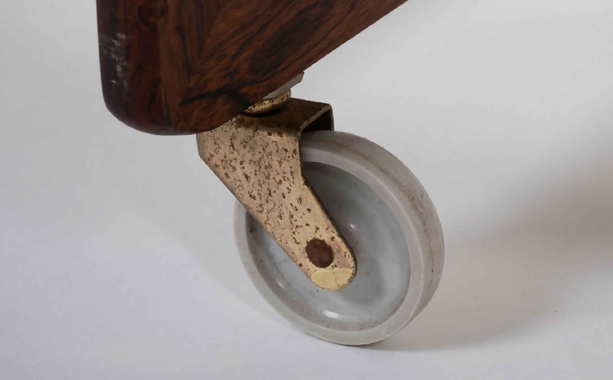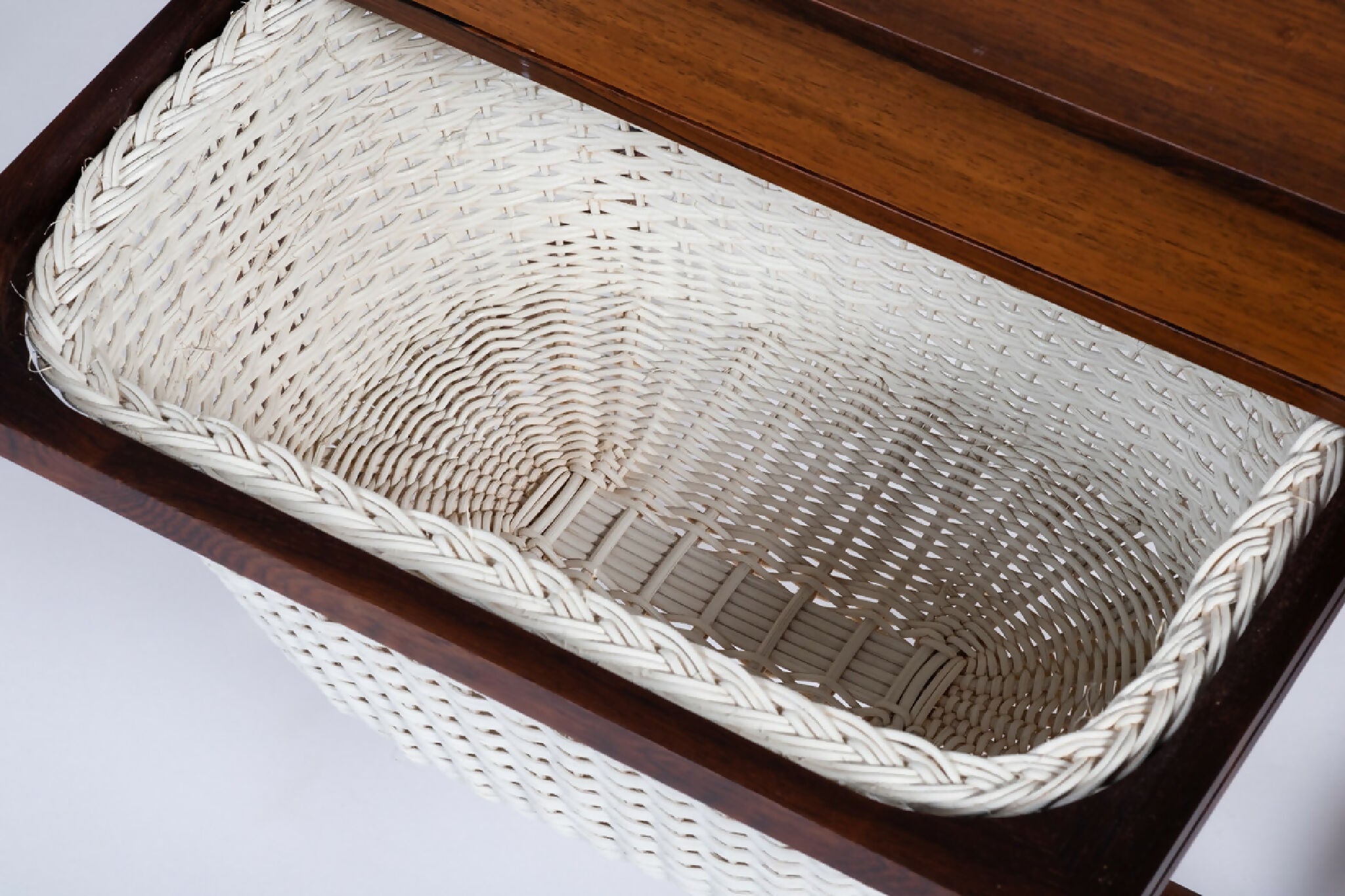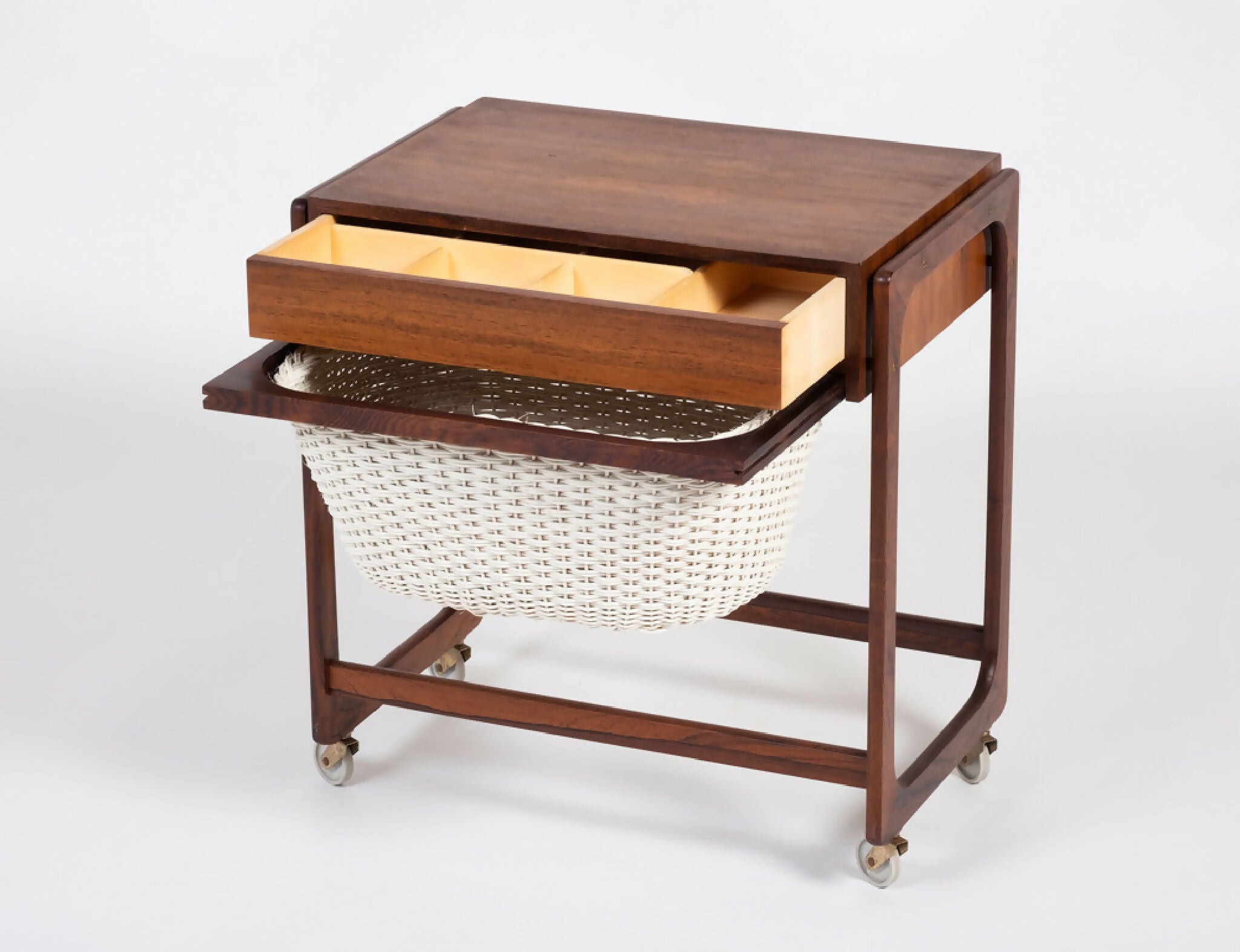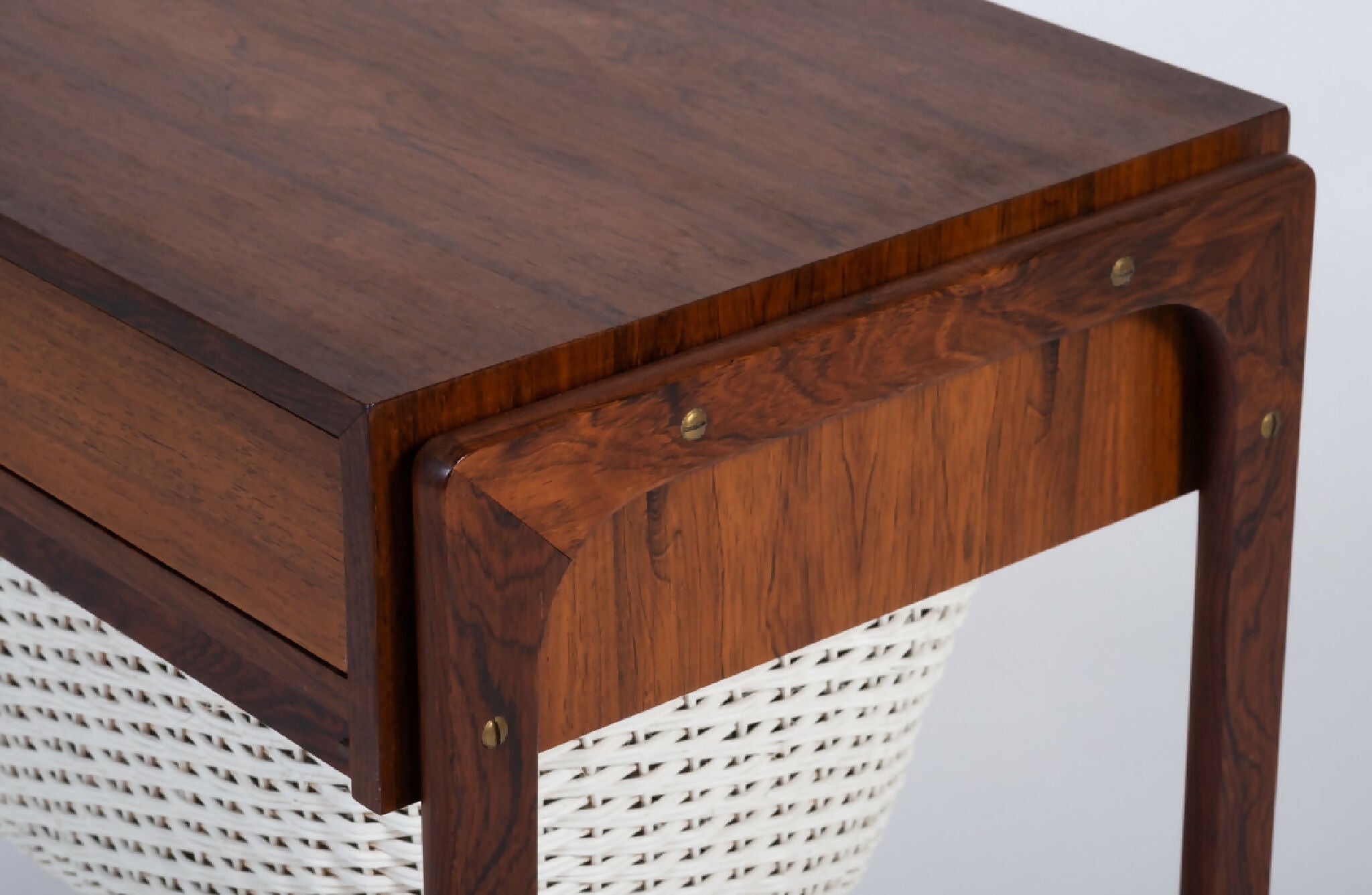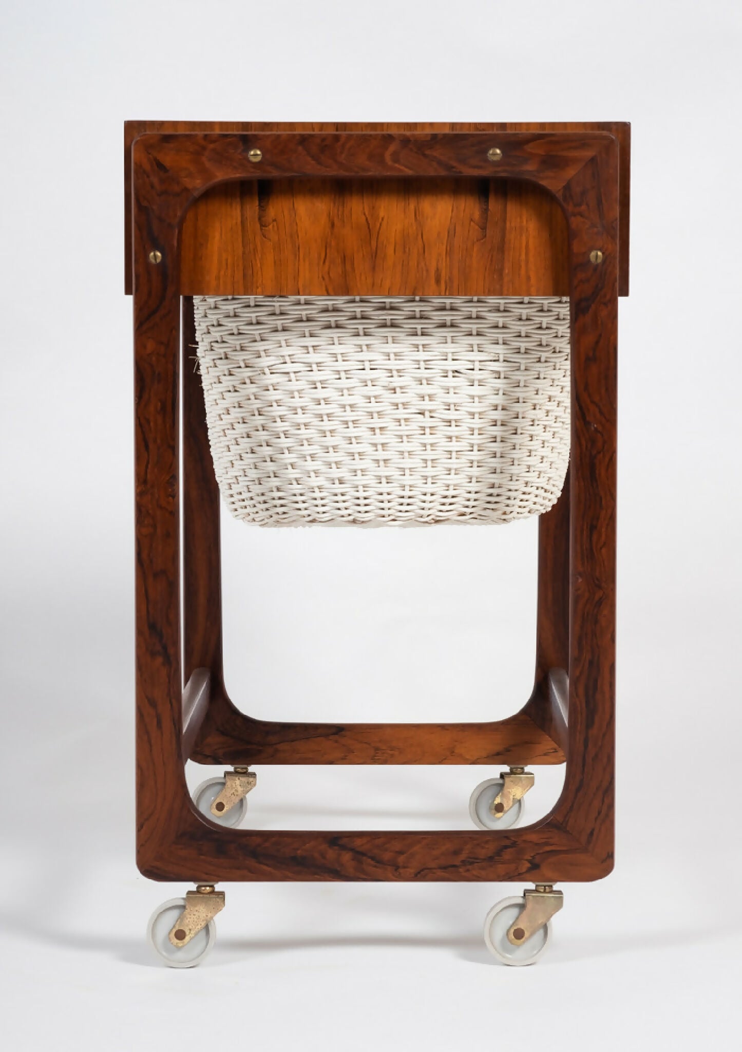 Model sminkebord udført i palisander og fremstillet af BR Gelsted i Danmark omkring 1960’erne. Møblet har en varm brun tone og et karakteristisk fletkurvselement under bordpladen, som skaber en harmonisk balance mellem materialerne. Skuffen glider let og giver god opbevaringsplads til diverse småting. Bordet står på hjul, hvilket gør det nemt at flytte rundt efter behov.