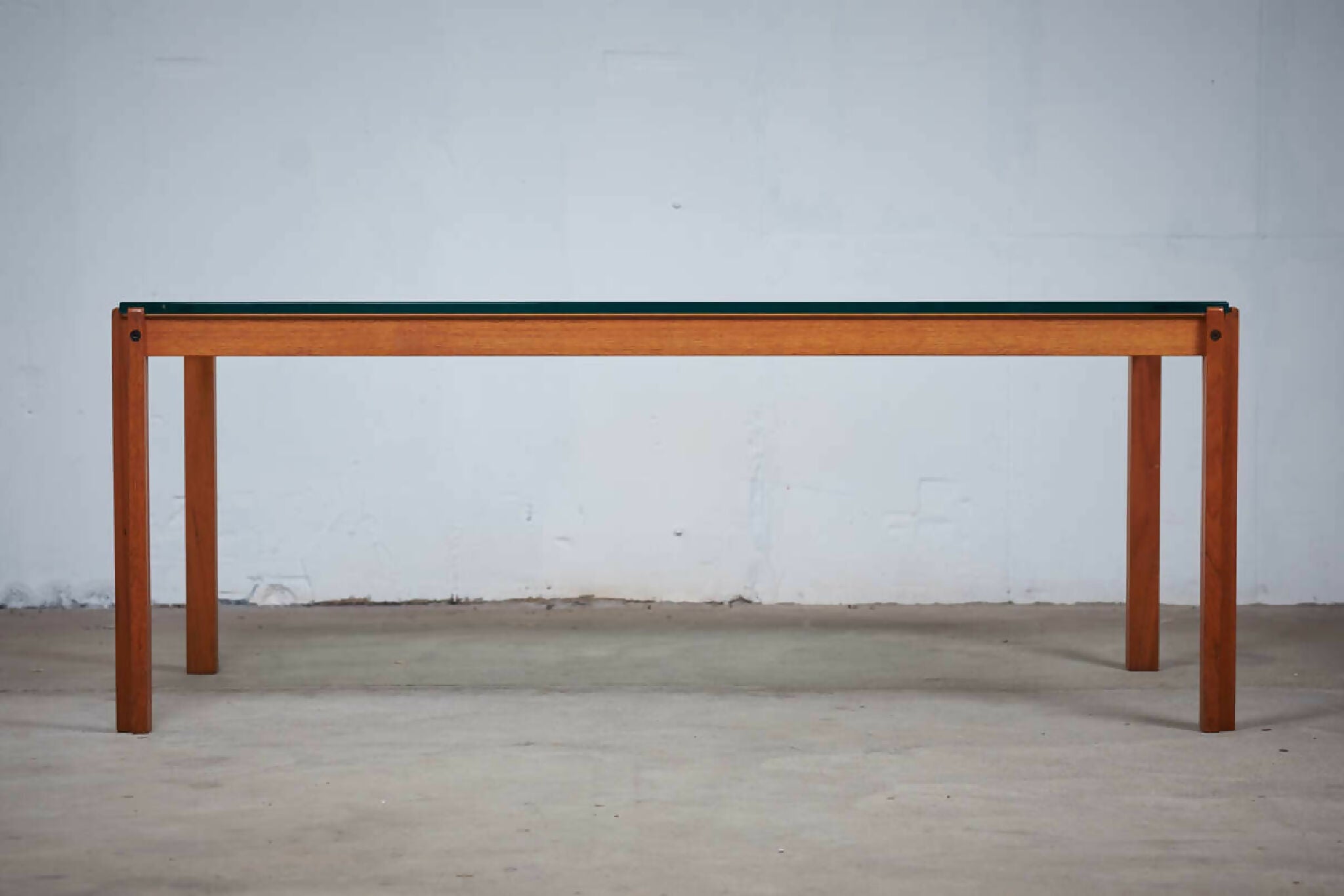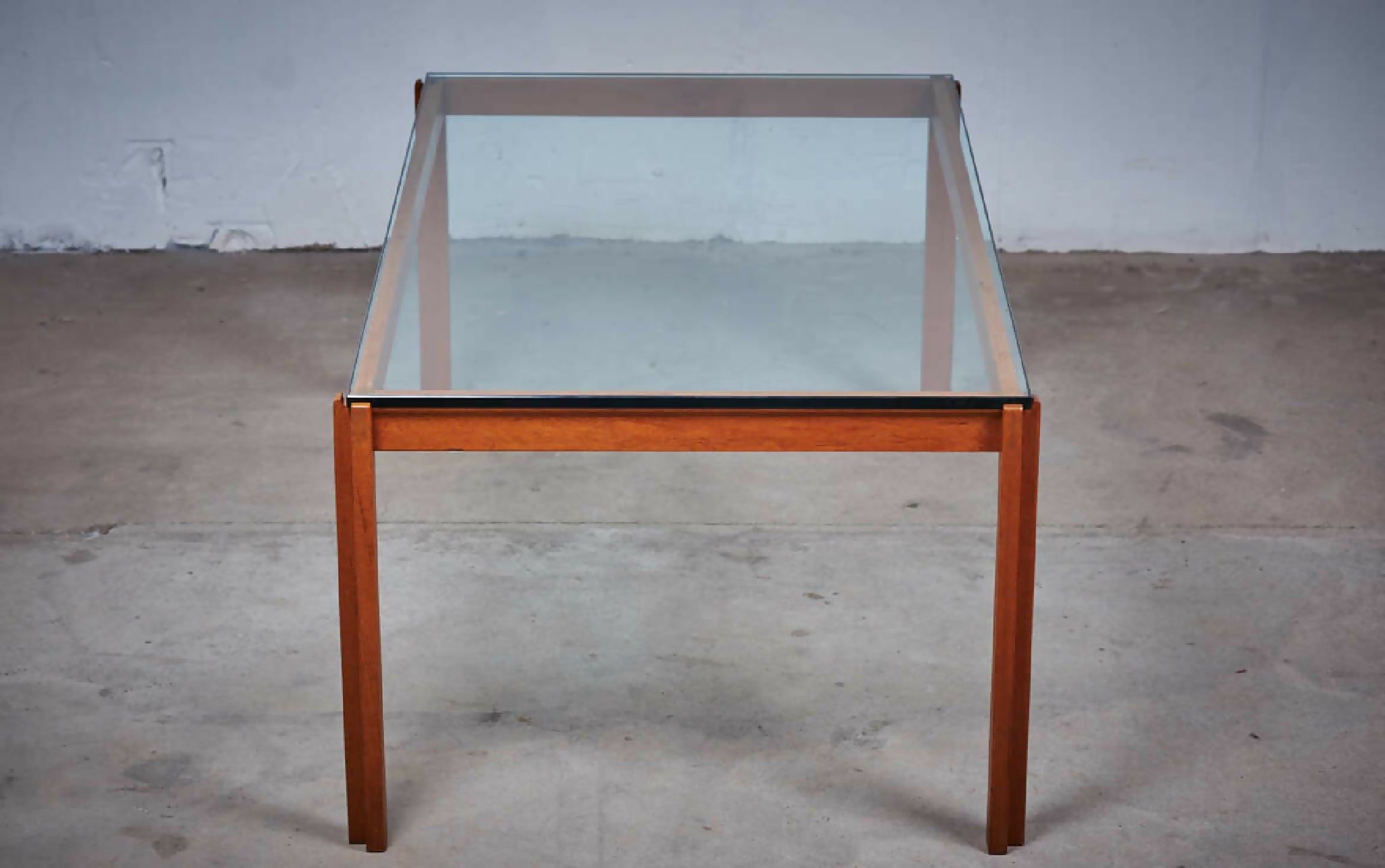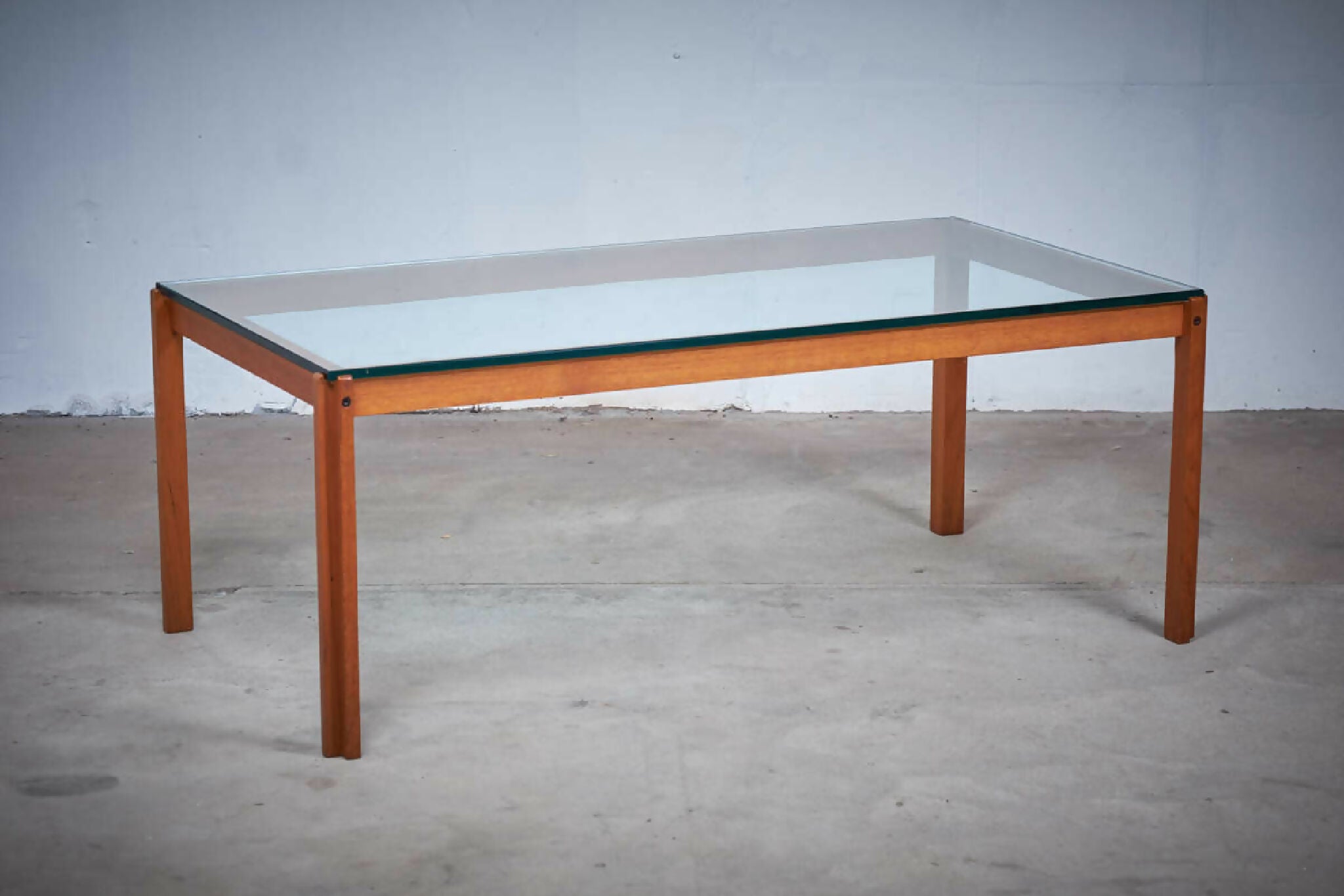 Sofabord udført i teak med topplade i glas, dansk design fra 1960’erne. Konstruktionen kombinerer teaktræets varme udtryk med glaspladens lethed, hvilket giver bordet et enkelt og afbalanceret formsprog. De rene linjer og materialevalget gør bordet velegnet til både klassiske og moderne indretninger.