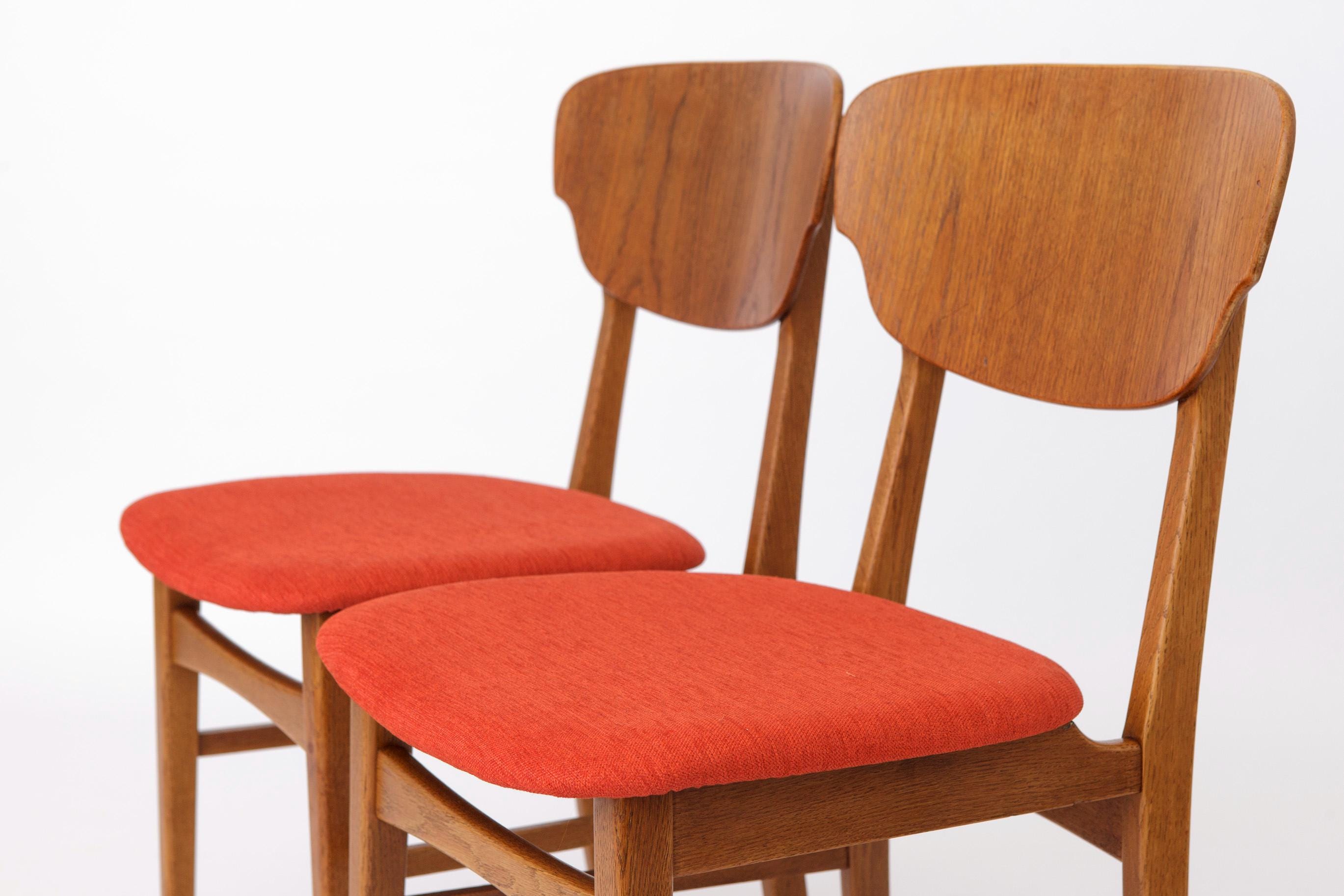 Model spisebordsstol udført i kombinationen teak og eg, dansk design fra 1960’erne. Konstruktionen består af robust egetræsramme og en rygdel i teak, hvilket giver stolen et karakteristisk og varmt formsprog. Sædet er nybetrukket med et rødt-orange tekstil, som tilfører et markant farveudtryk.