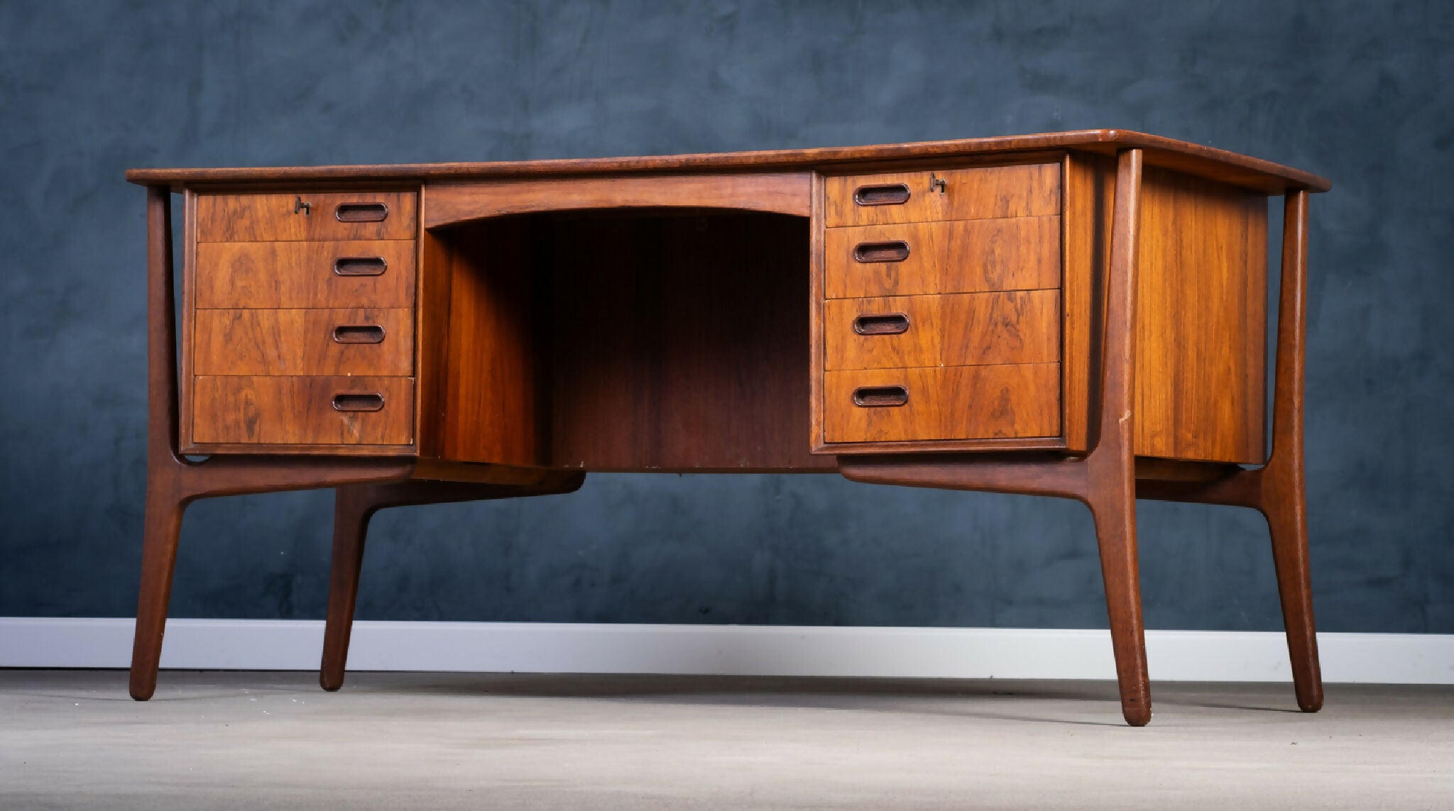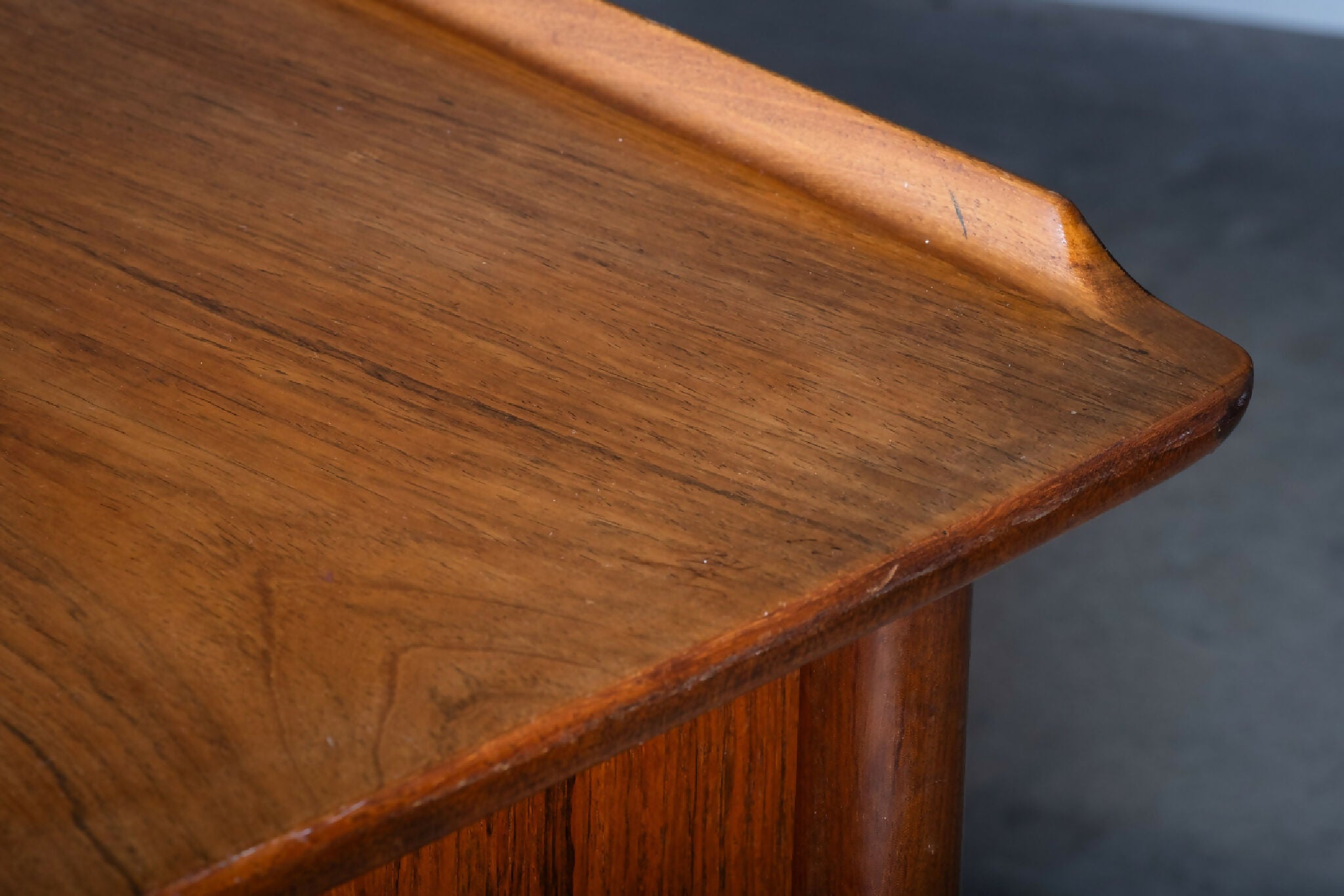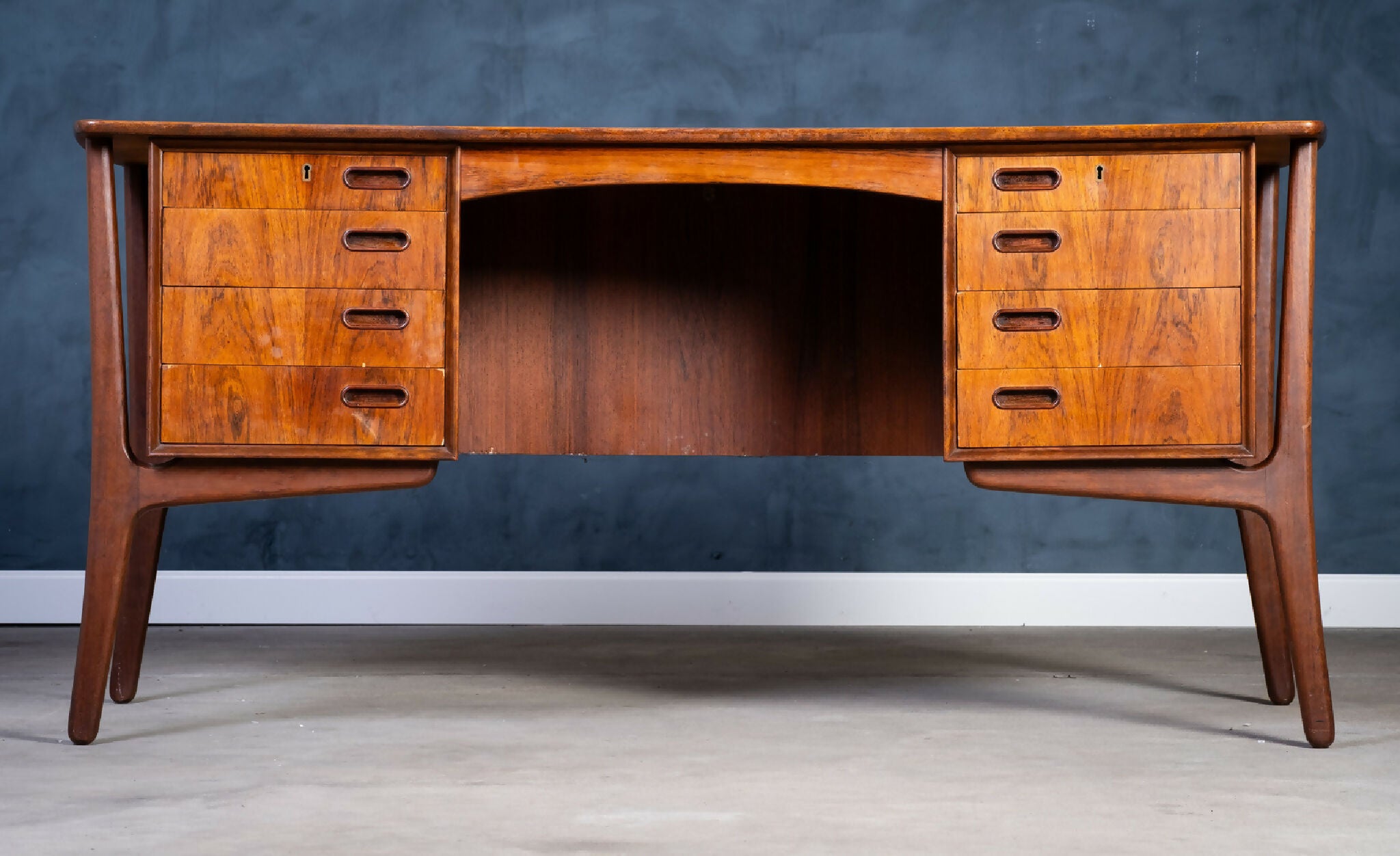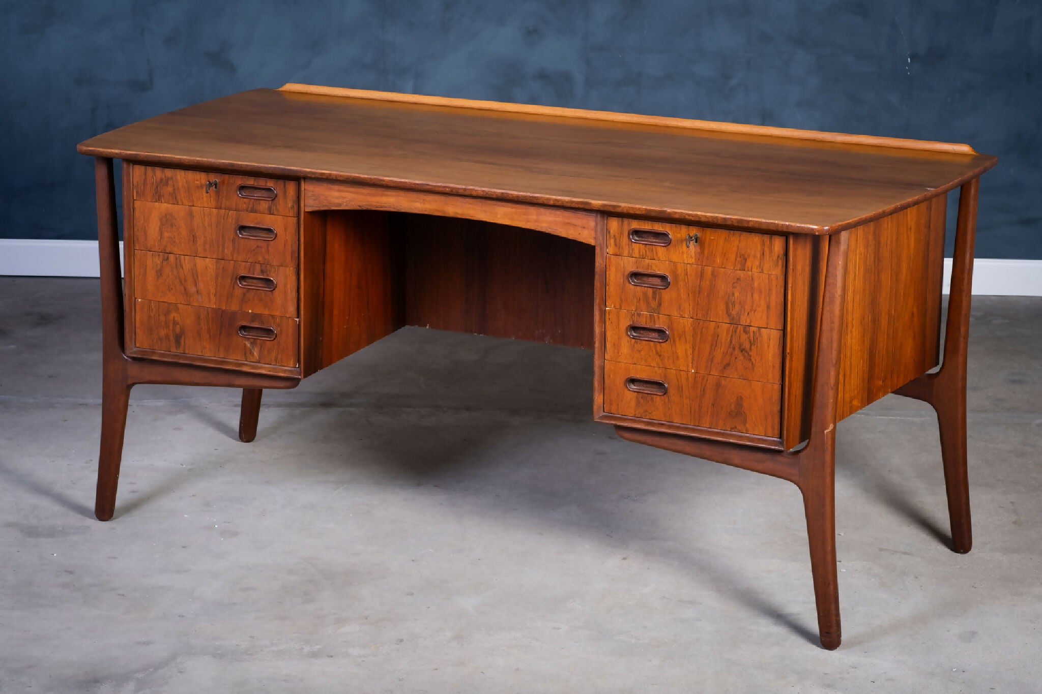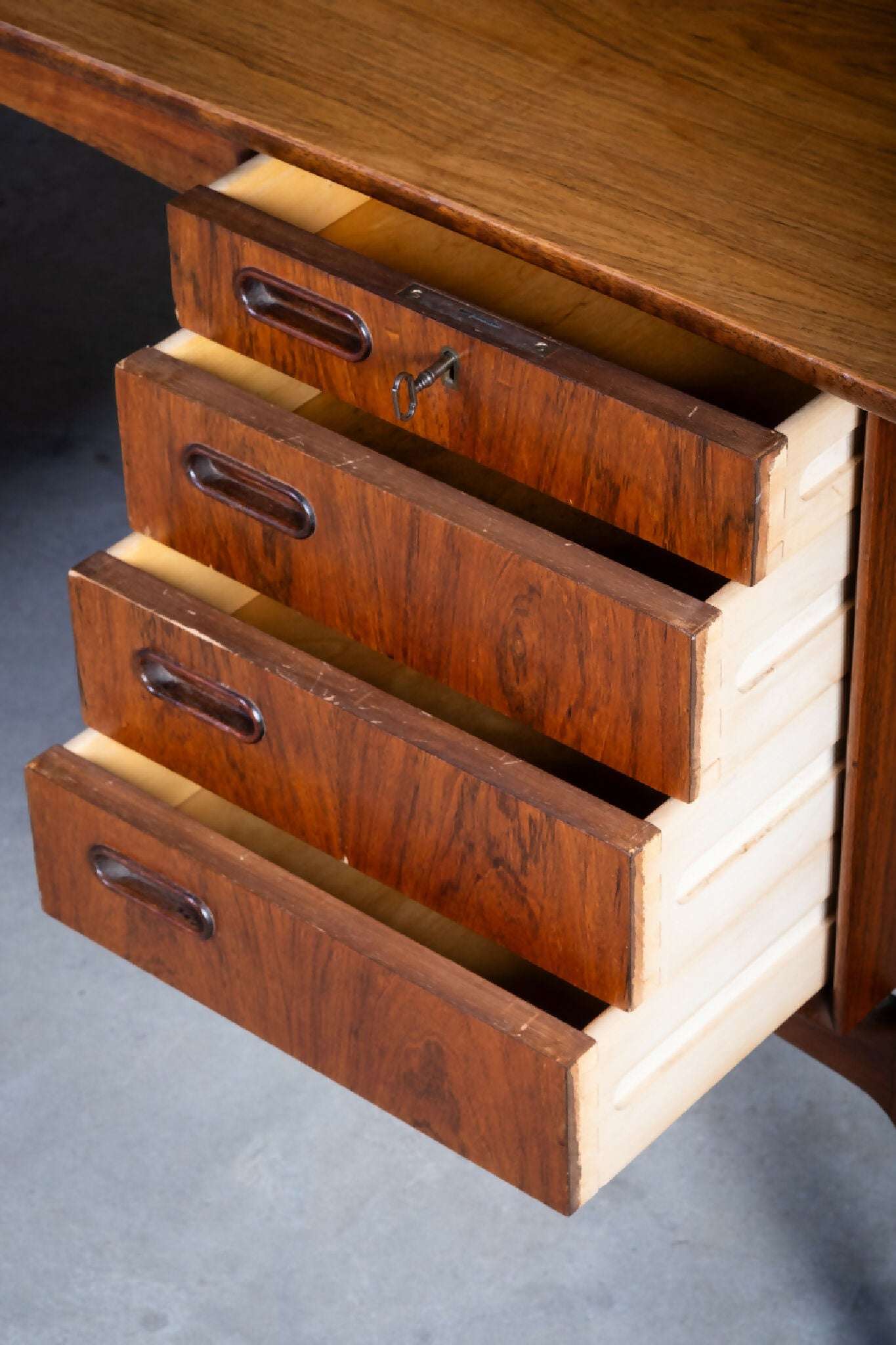 Smukt skrivebord designet af Svend Åge Madsen og produceret af H.P. Hansen i 1960’erne. Bordet er udført i udsøgt palisander med enestående håndværksmæssige detaljer og Madsens karakteristiske organiske linjer.