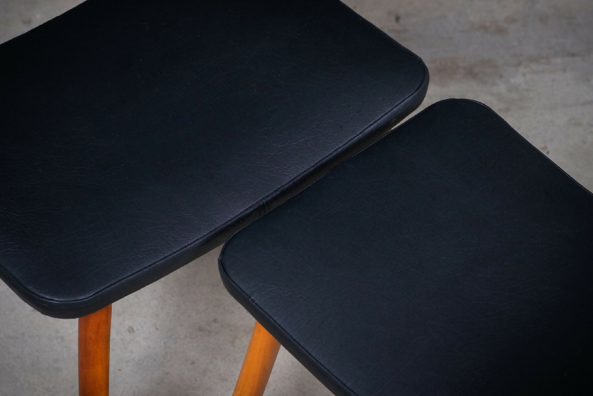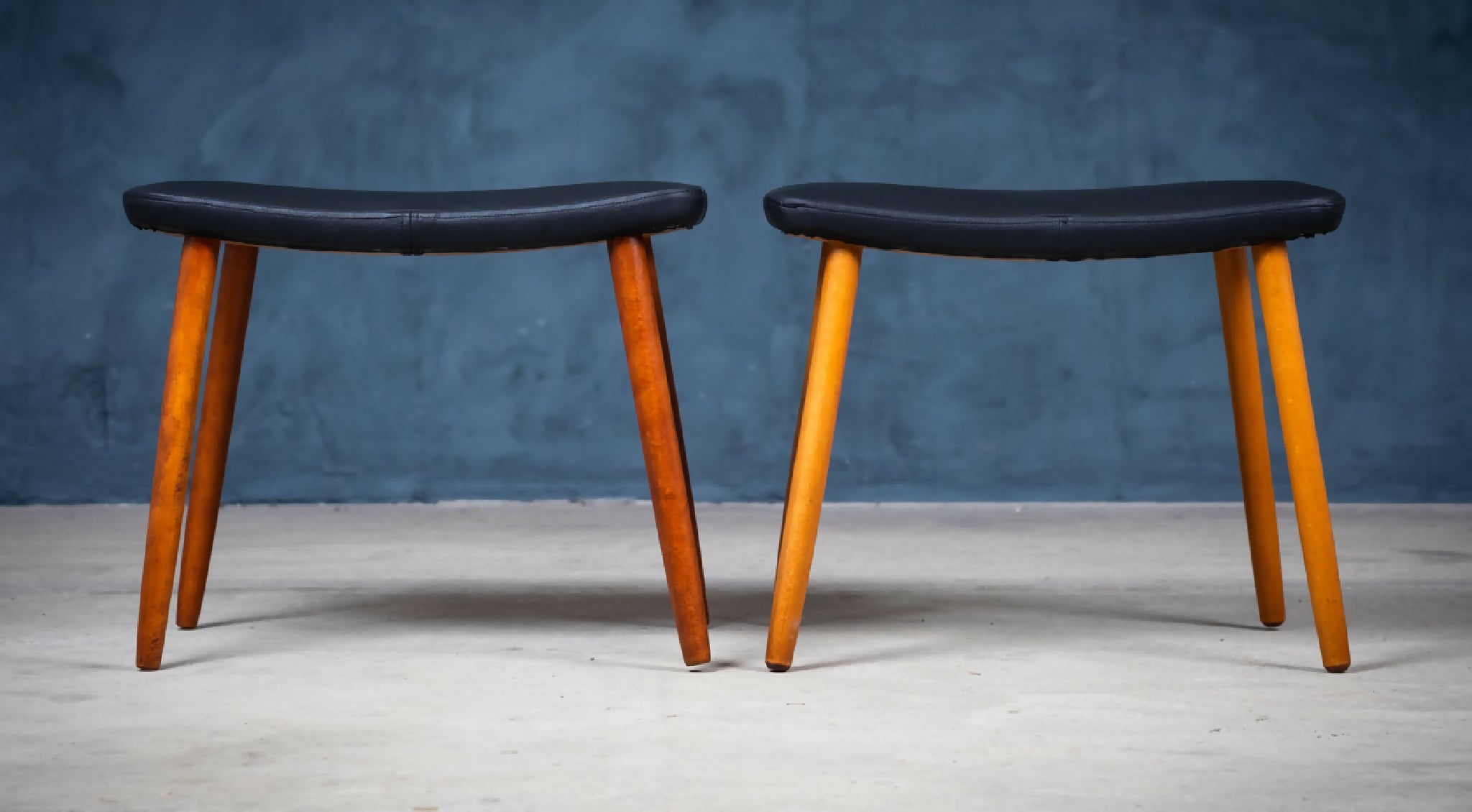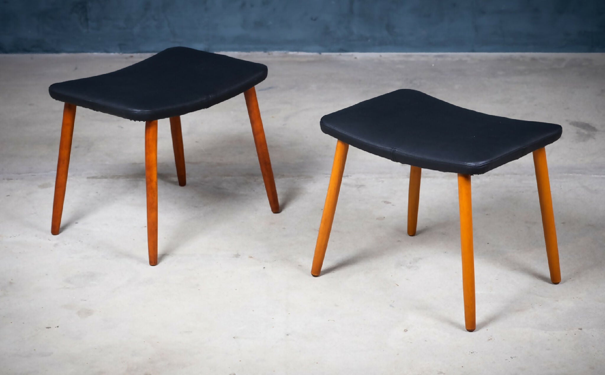 Par taburetter udført i bøg med let skrånende ben, dansk design fra omkring 1960’erne. Sæderne er nyligt ombetrukket med sort kunstlæder, hvilket giver et rent og moderne udtryk, der harmonerer med den varme glød i bøgetræet.