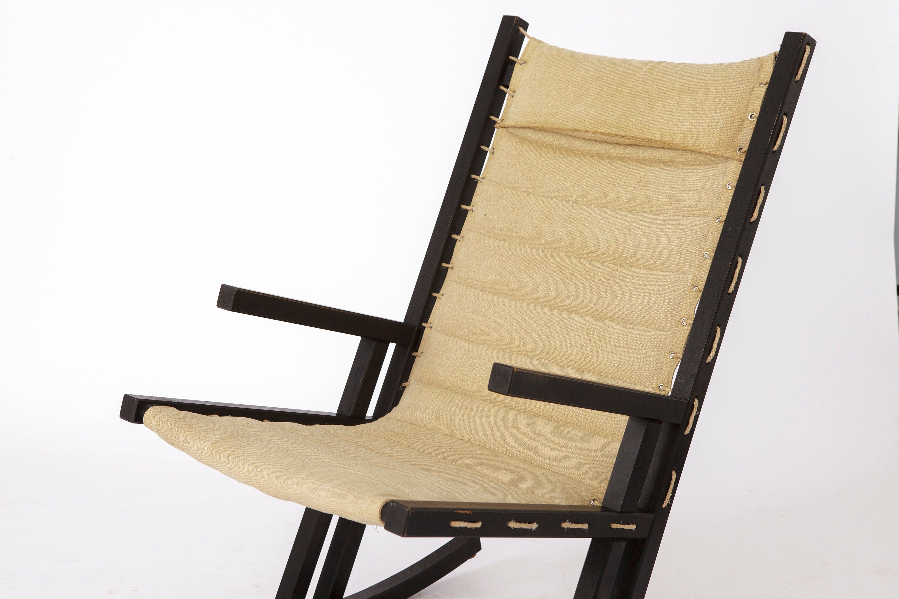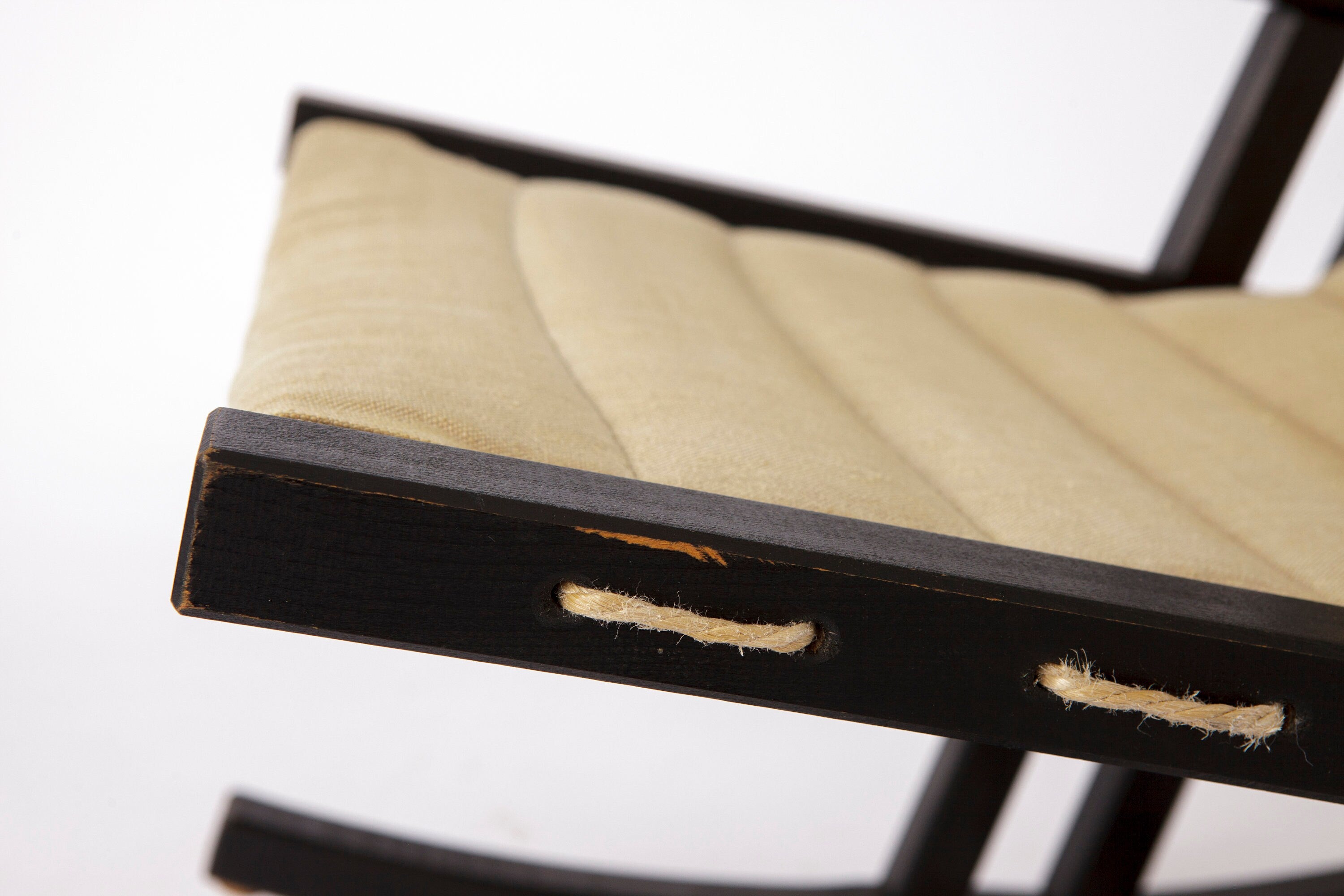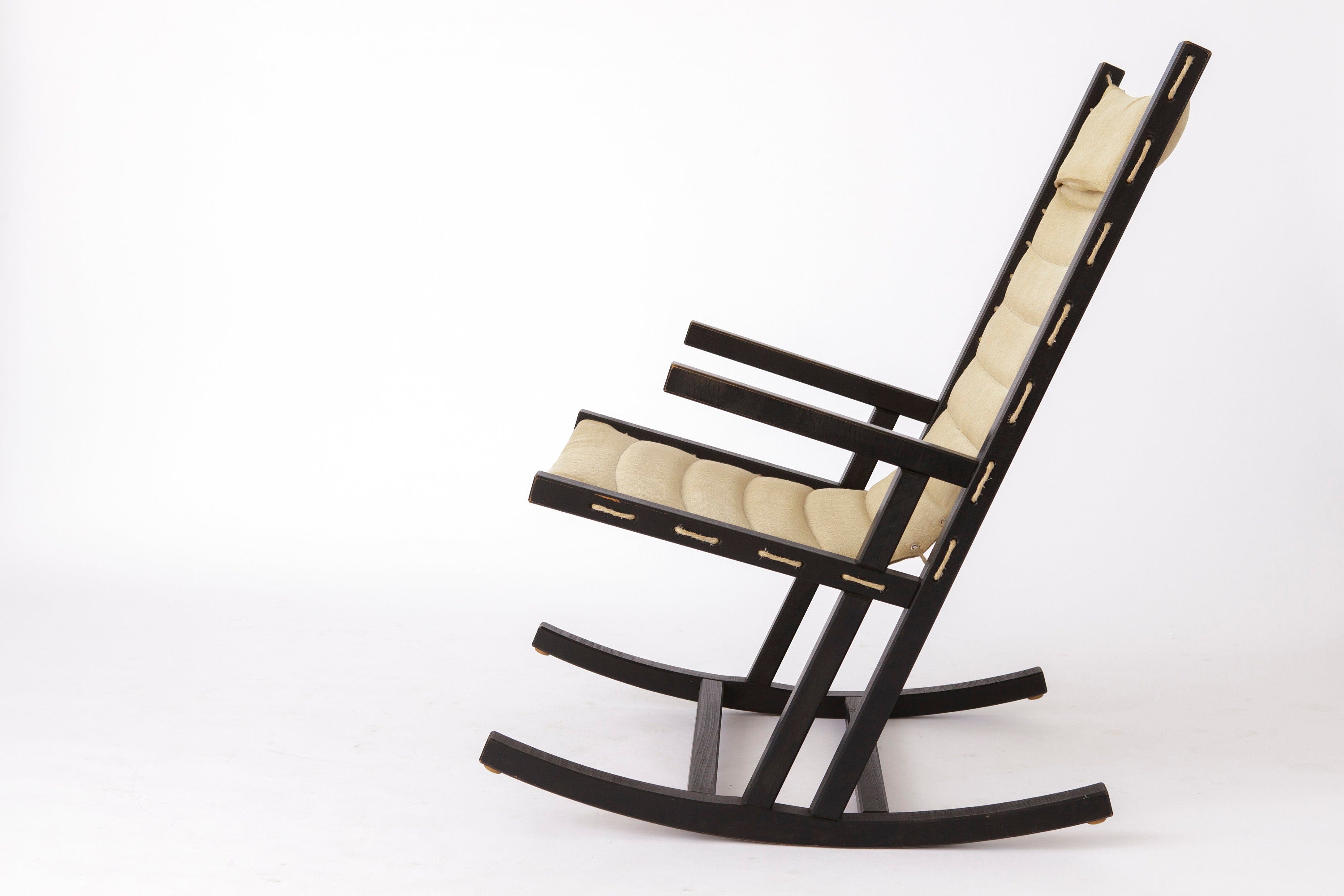 Elegant og minimalistisk gyngestol fremstillet af Casala i Tyskland i 1960’erne. Stolen har et sortlakeret stel i bøgetræ og et betræk i beige bomuld, som er professionelt renset af møbelrenseri. Et smukt eksempel på tysk modernistisk design, hvor enkelhed og funktion går op i en harmonisk helhed.