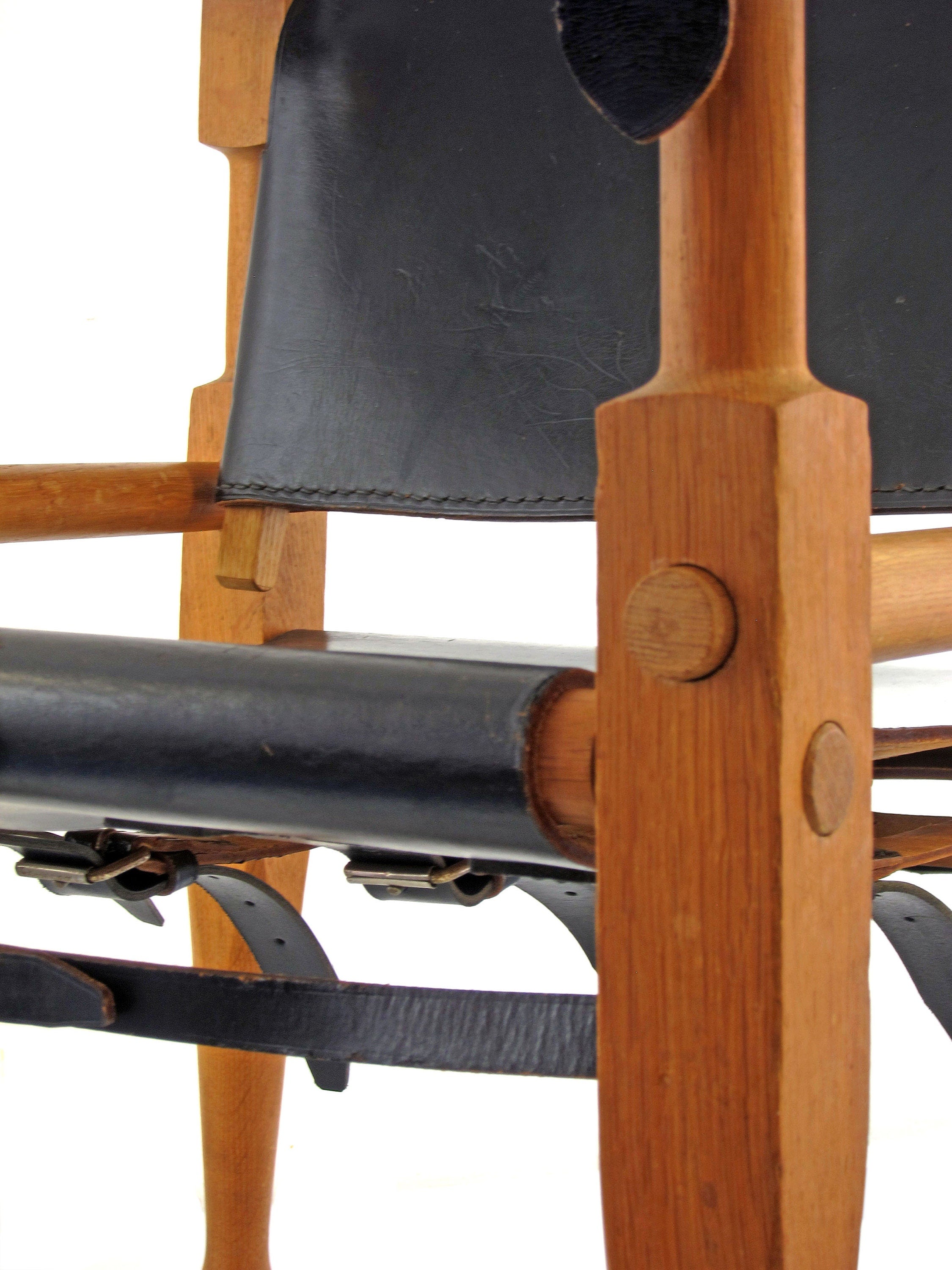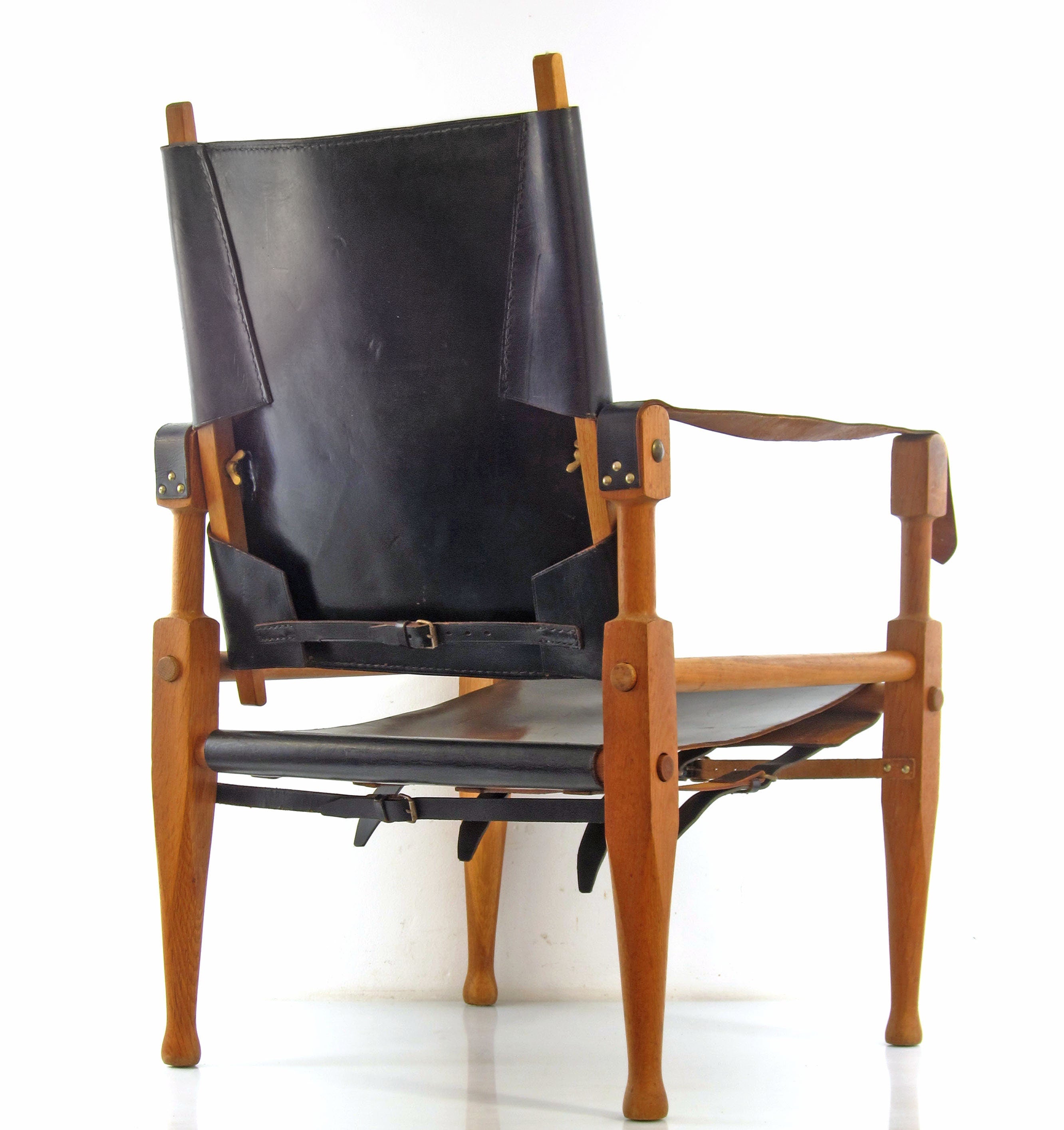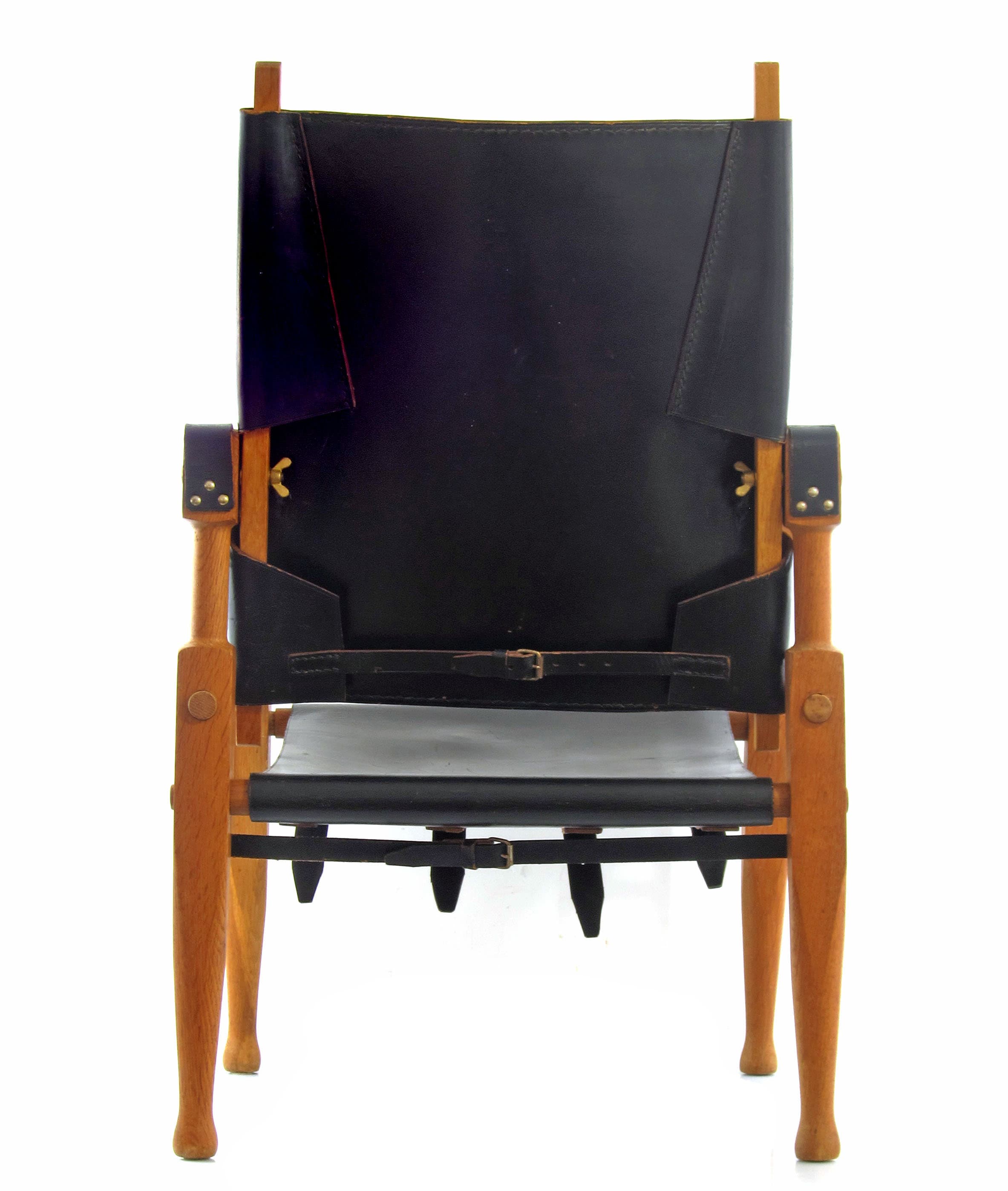 Model safari lænestol designet af Wilhelm Kienzle i 1928 for Wohnbedarf i Zürich. Stolen er udført i massiv eg med beslag i bronze og kraftigt sort læder, som har udviklet en smuk og naturlig patina over tid. Konstruktionen er let og funktionel, men samtidig solid, og formsproget er præget af tidlig modernisme med fokus på materialernes ærlighed og samlingernes klarhed.