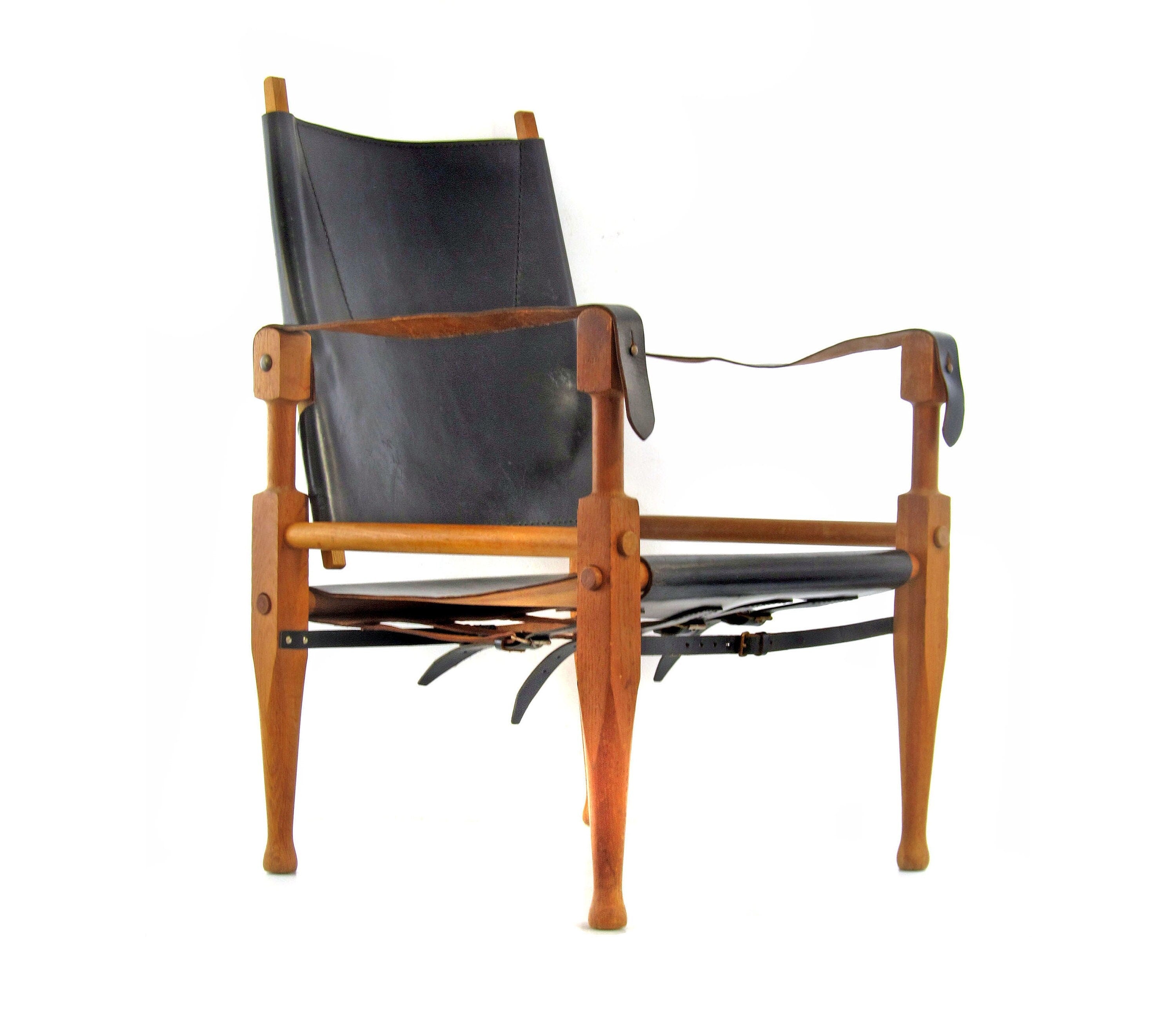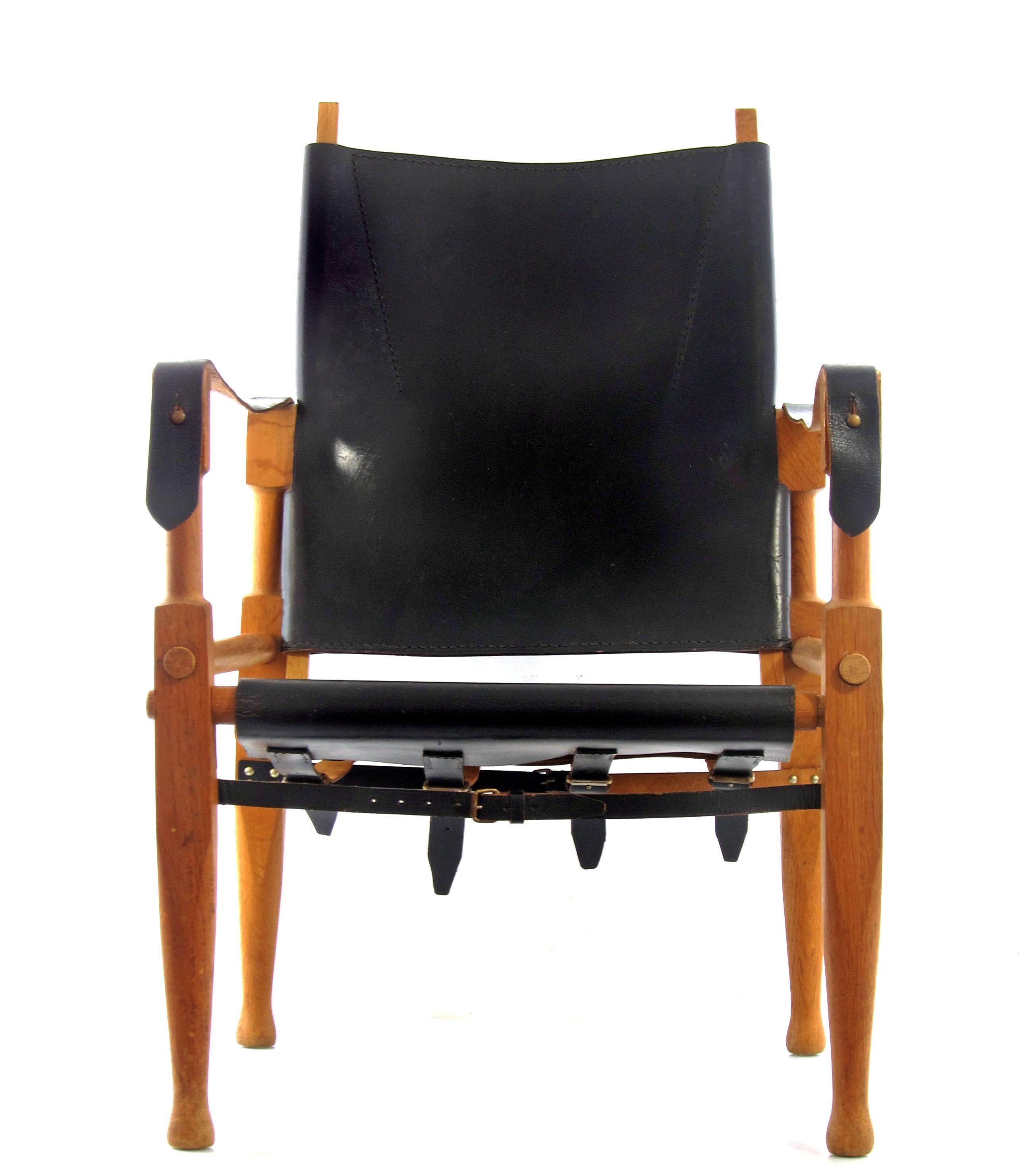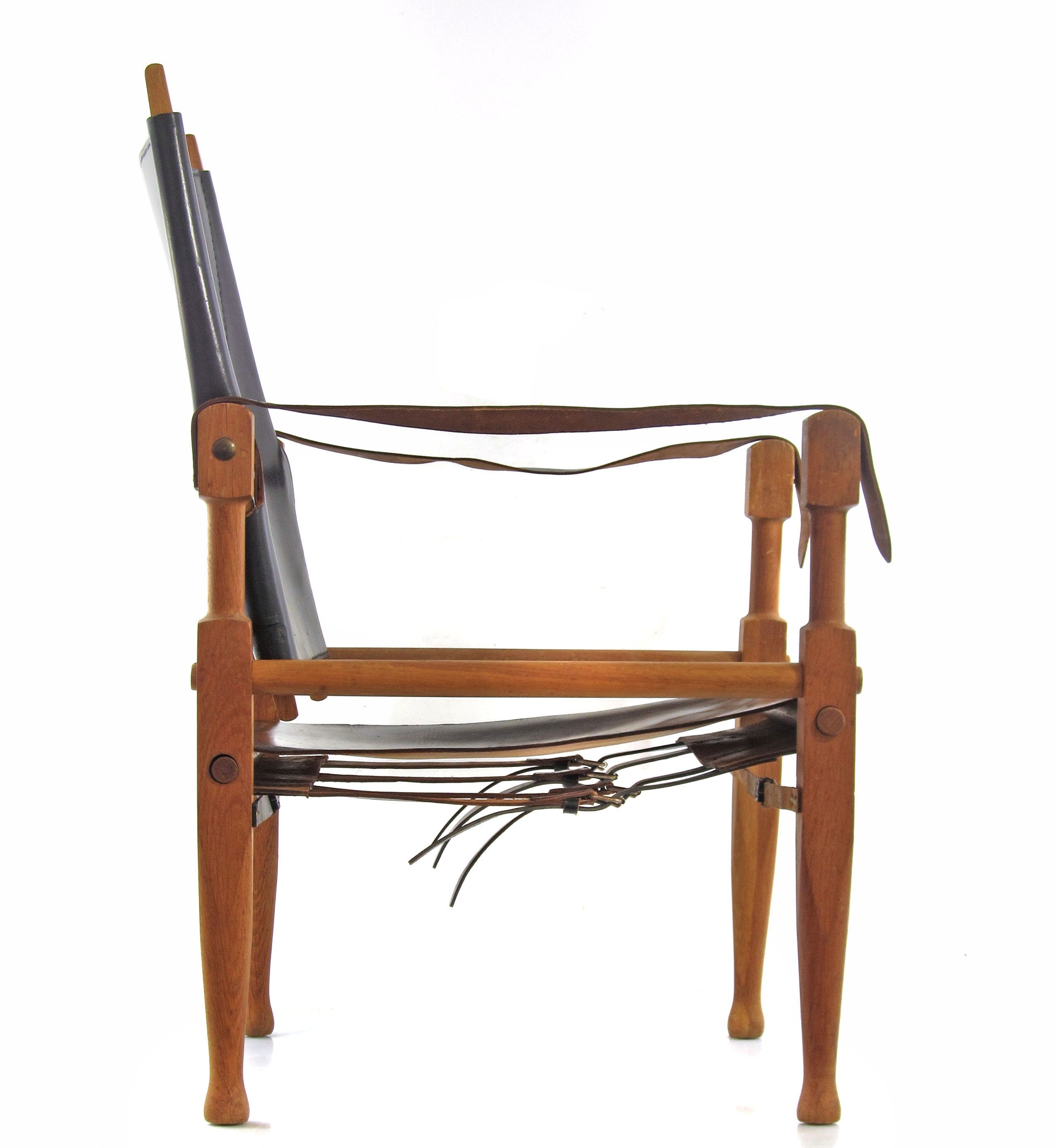 Model safari lænestol designet af Wilhelm Kienzle i 1928 for Wohnbedarf i Zürich. Stolen er udført i massiv eg med beslag i bronze og kraftigt sort læder, som har udviklet en smuk og naturlig patina over tid. Konstruktionen er let og funktionel, men samtidig solid, og formsproget er præget af tidlig modernisme med fokus på materialernes ærlighed og samlingernes klarhed.
