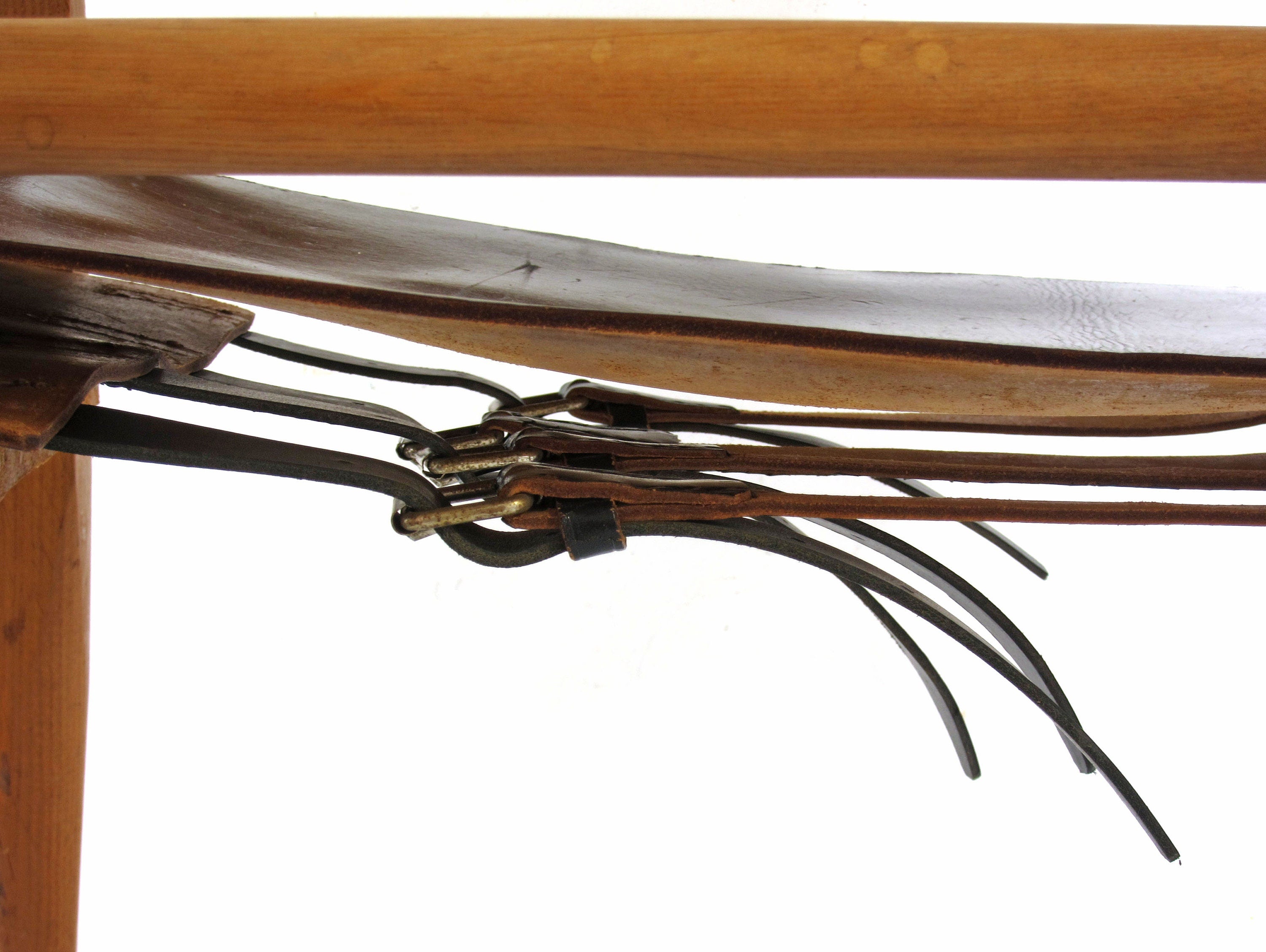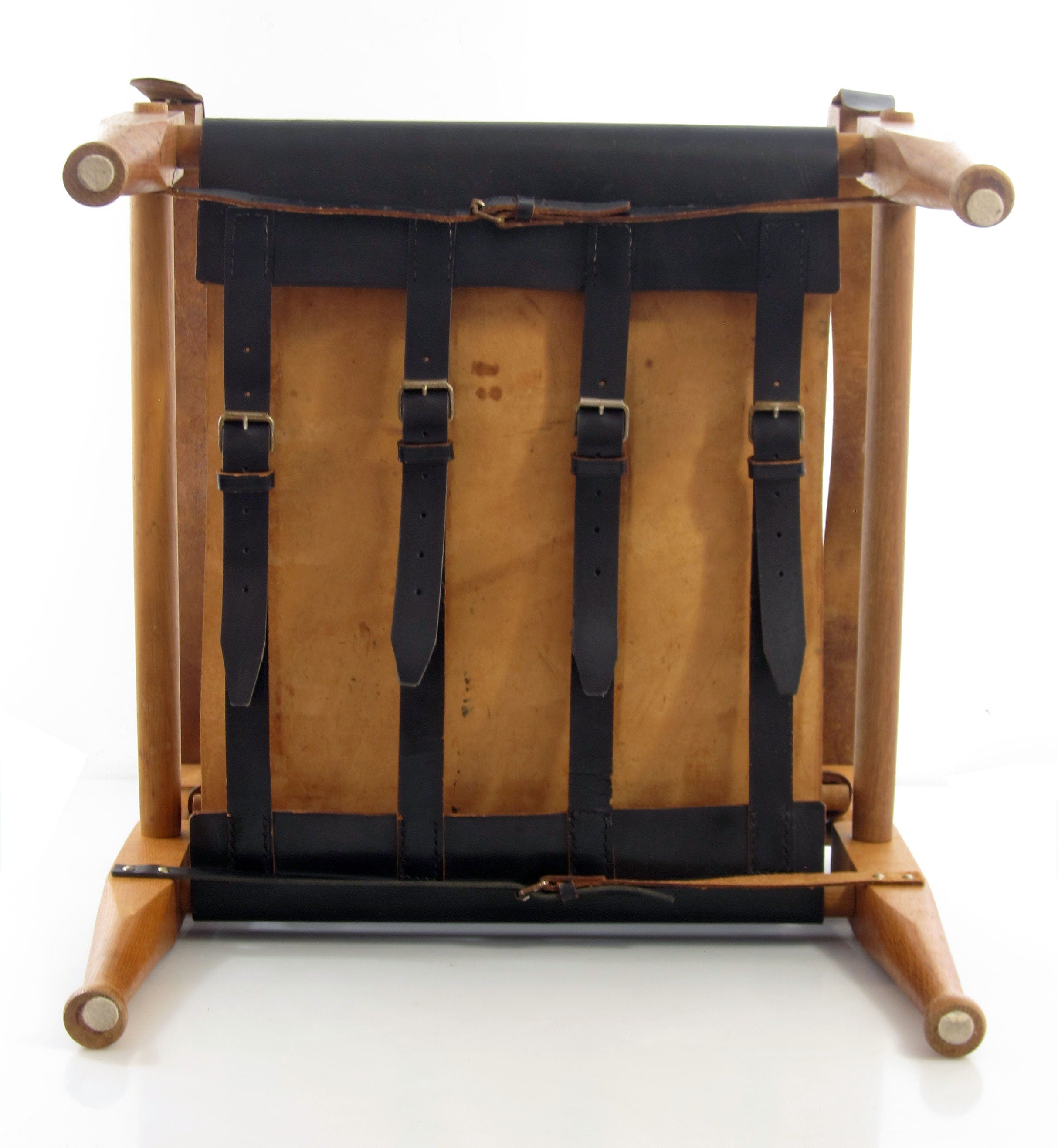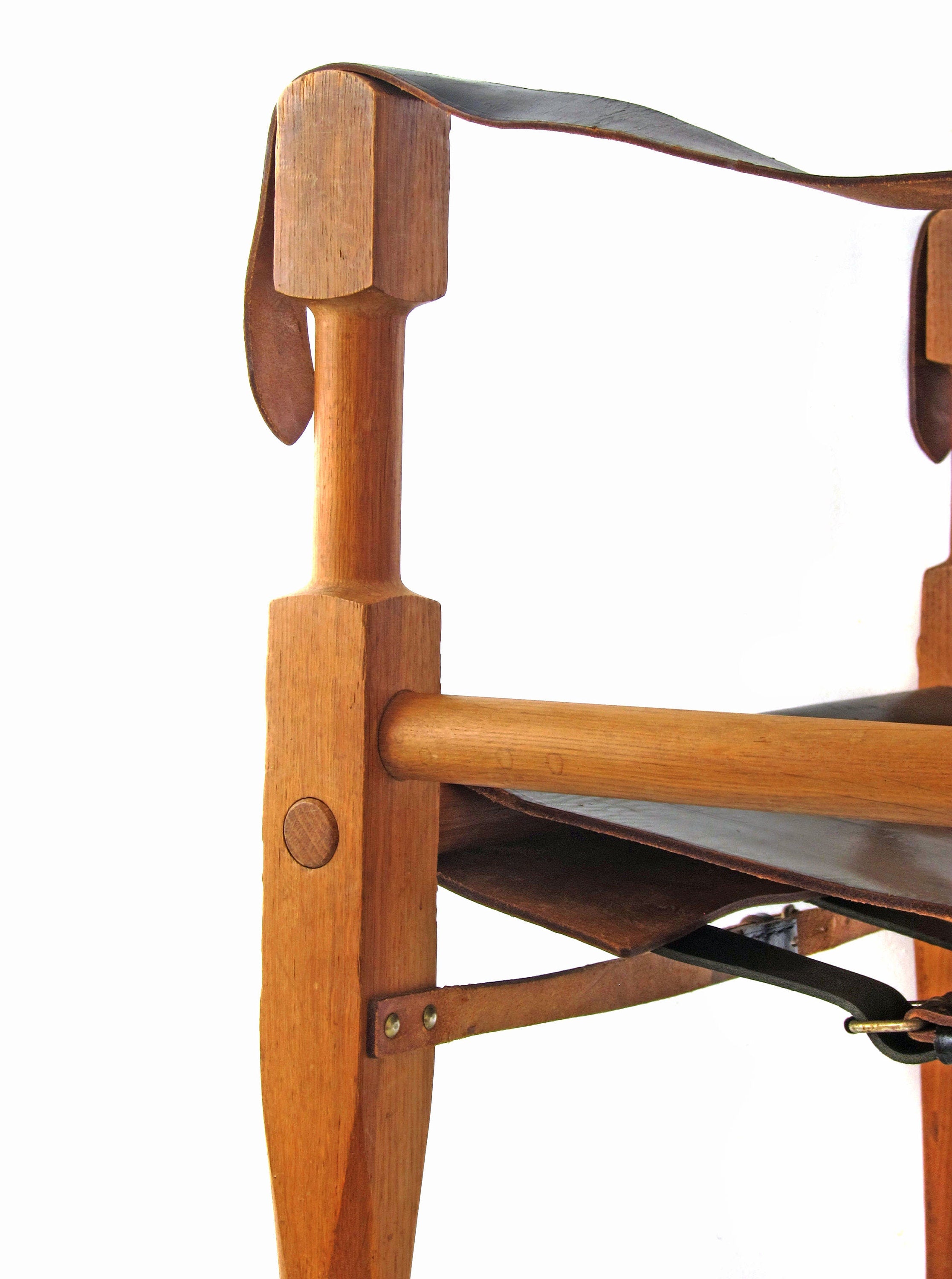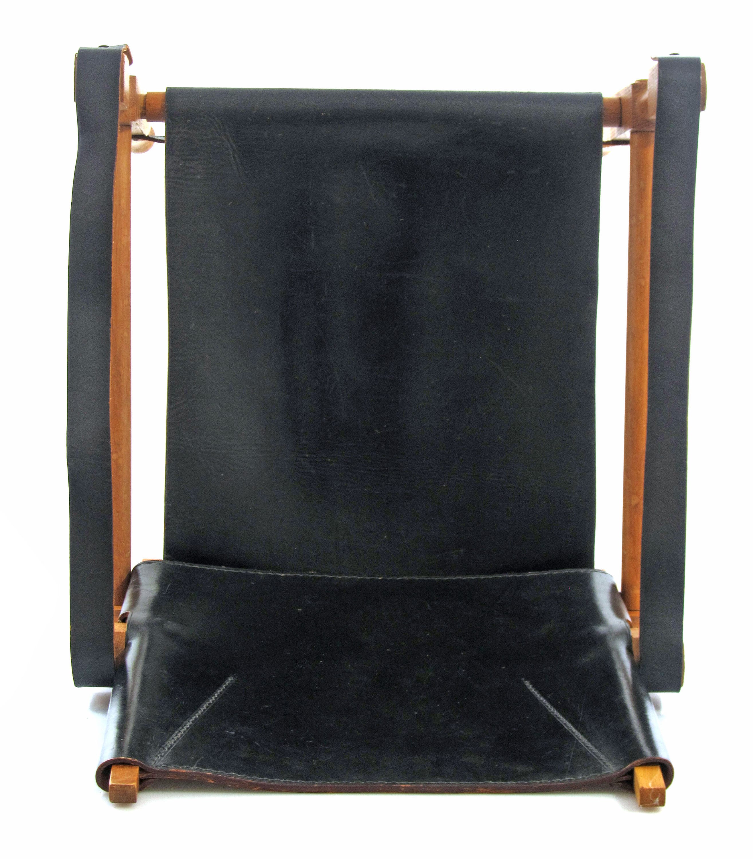 Stolen fremstår med alderssvarende brugsspor, og enkelte læderremme er nænsomt udskiftet, så funktion og komfort er bevaret. Et karakterfuldt møbel, der fungerer som markant blikfang i indretningen og henvender sig til samlere og kendere af tidligt modernistisk design.